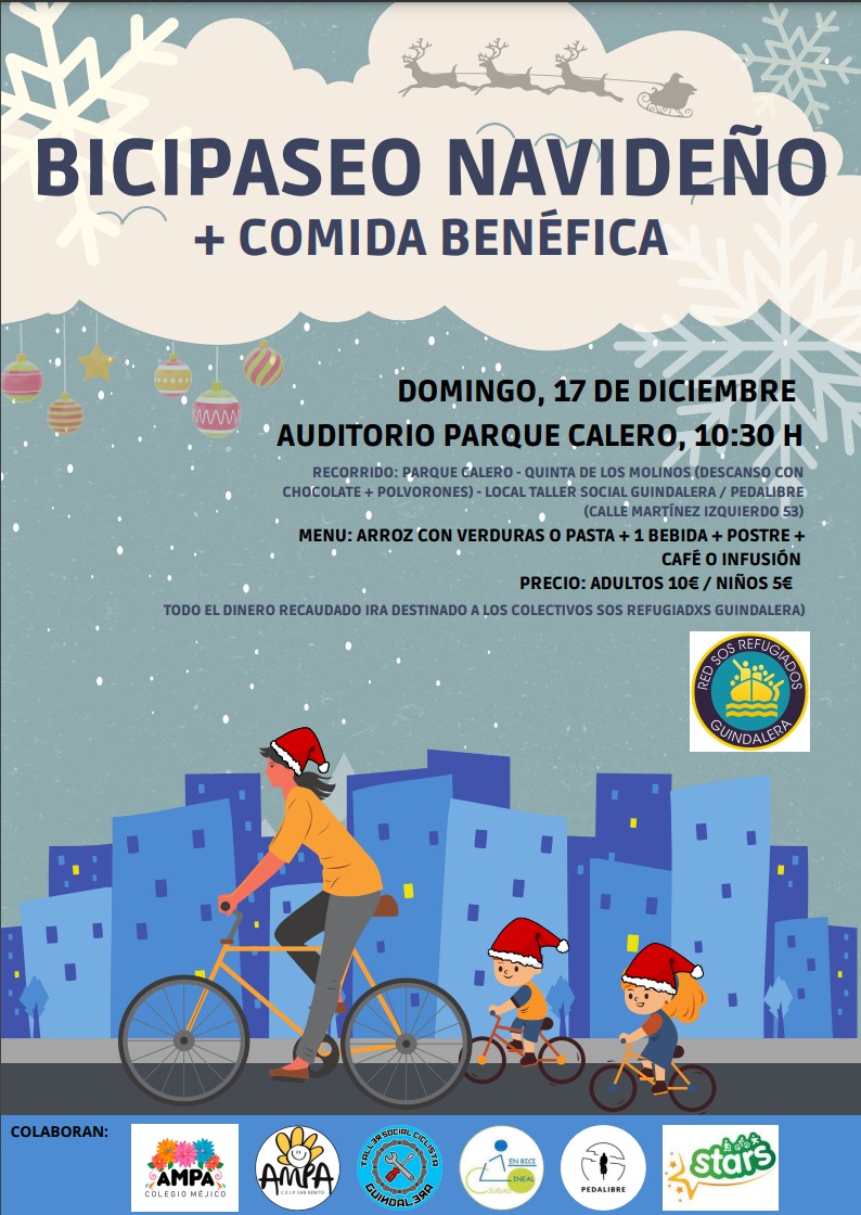 Un paseo en bici navideño en el que tomaremos polvorones y chocolate en la Quinta de los Molinos y ya en nuestro local de Martínez Izquierdo, comeremos a beneficio de SOS Refugiados Guindalera y el proyecto Bicis Temporeras de Jerez de la Frontera.