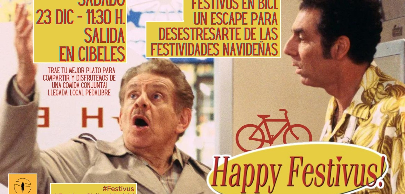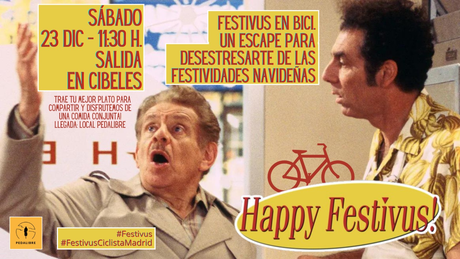 Únete a la celebración del Festivus sobre ruedas del próximo 23 de diciembre. Nos encontraremos a las 11:30 en la explanada de Cibeles para una emocionante ruta en bici por la ciudad. ¡Un escape para desestresarte de las festividades navideñas! 🚴♂️ Pedalearemos sosegadamente evitando las demostraciones de fuerza durante la ruta y, al llegar al local de Pedalibre (calle Martínez izquierdo, 53), celebraremos el Airing of Grievances participando de anécdotas y quejas ciclistas del año 2023. ¡Trae tu mejor plato para compartir y disfrutemos de una comida conjunta! Además, tendremos bebidas a solo 1 euro en el local de Pedalibre. ¡No te lo pierdas! 🎉