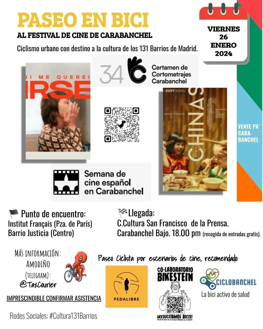 Esta semana del 22 al 28 de enero, la alfombra roja se extiende hasta el Festival de Cine español de Carabanchel 🤩. Súbete a la bici y busca tu ritmo para superar la cuesta de enero, escapar del Centro y recorrer los escenarios de cine de Madrid, Carabanchel, y todo el año ¡los 131 Barrios!