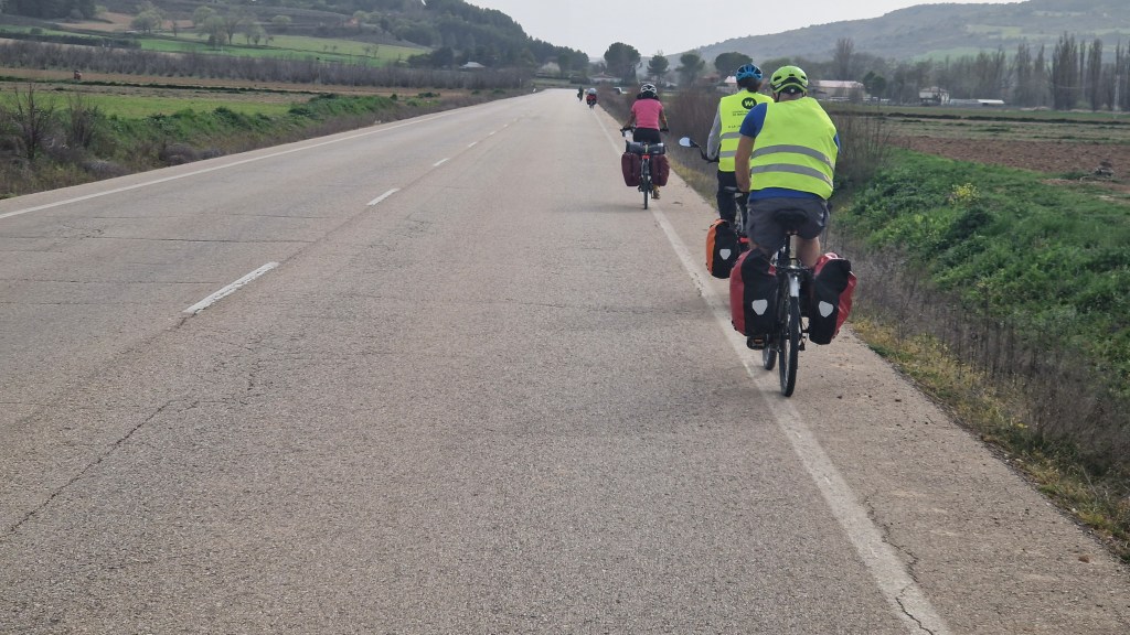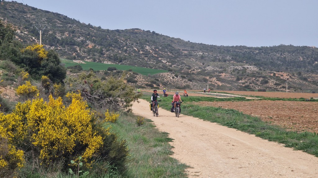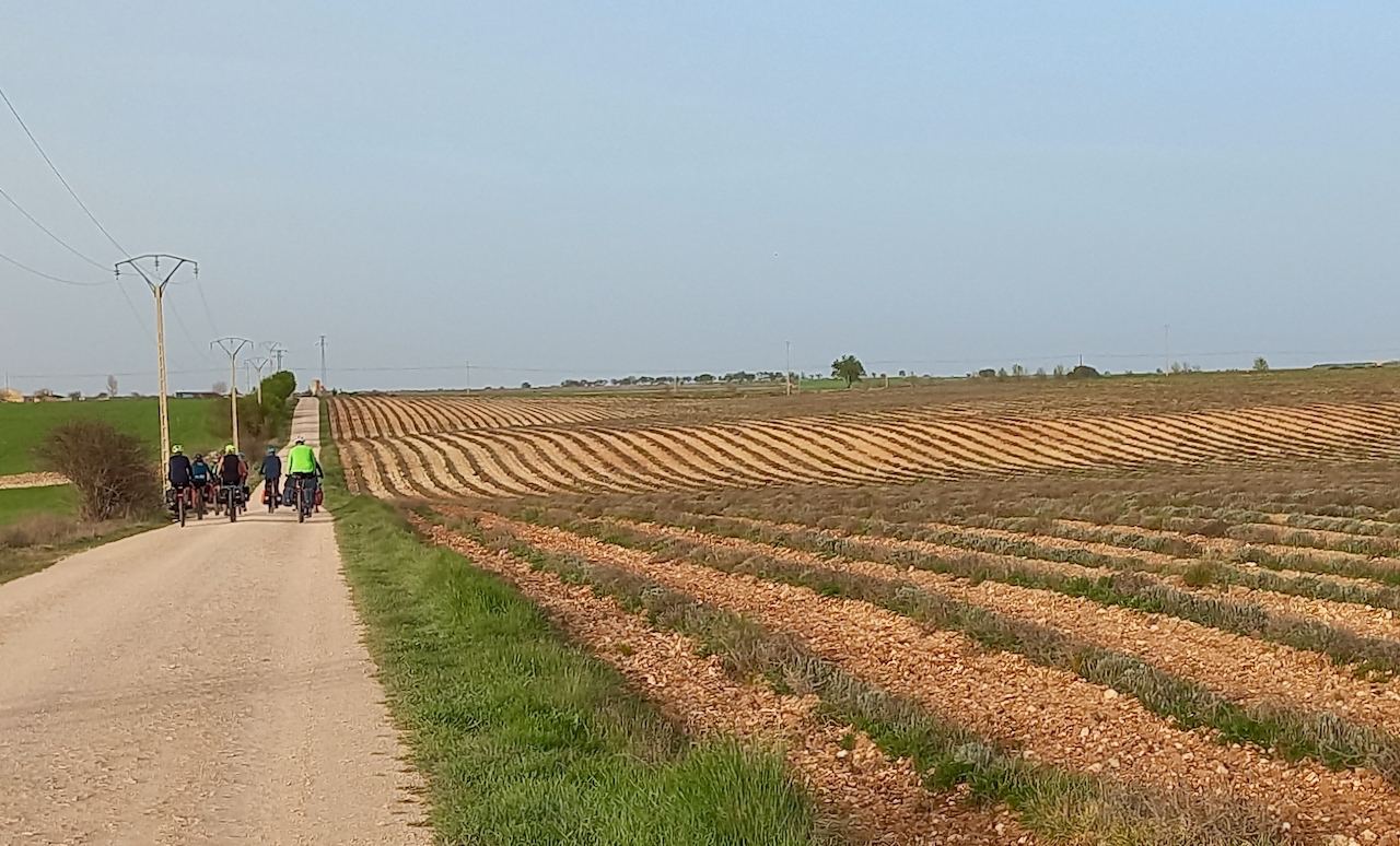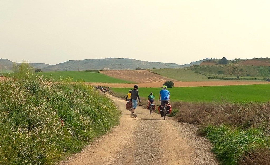 Llegamos a Torija, donde nos espera el asombroso castillo, sede por cierto del museo sobre el libro histórico de Camilo José Cela, y para nuestra sorpresa nos encontramos con la fiesta anual de las gachas. Algunos incluso participan del jurado. Risas, probamos varias tipologías, comida compartida en el pequeño parque con fuente, y retomamos el camino, esta vez tierra adentro separados de la autovía. Seguimos un rato también las vías del AVE a Barcelona, pasa un Iryo estruendoso, y compartimos pensamientos acerca del impacto ambiental enorme en términos de territorio, de cables, de infraestructuras que supone una línea de alta velocidad.