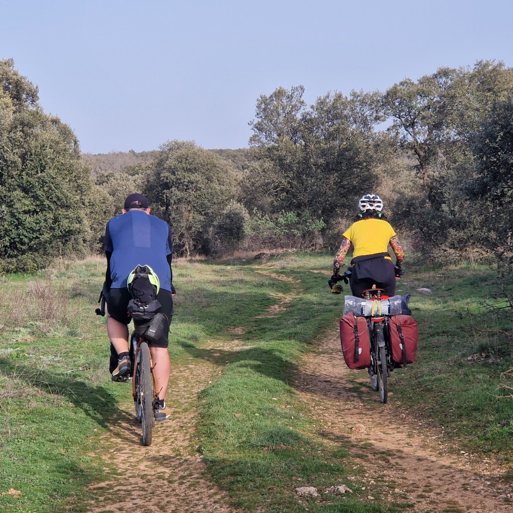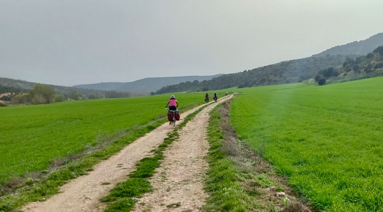 Nos adentramos en una dehesa de encina, ha llovido y la tierra se ha secado, las rodadas han quedado marcadas en el barro, mucho cuidadito (alguien dice: «Las rodadas las marca el diablo»). Poco a poco nos vamos acercando a Brihuega.