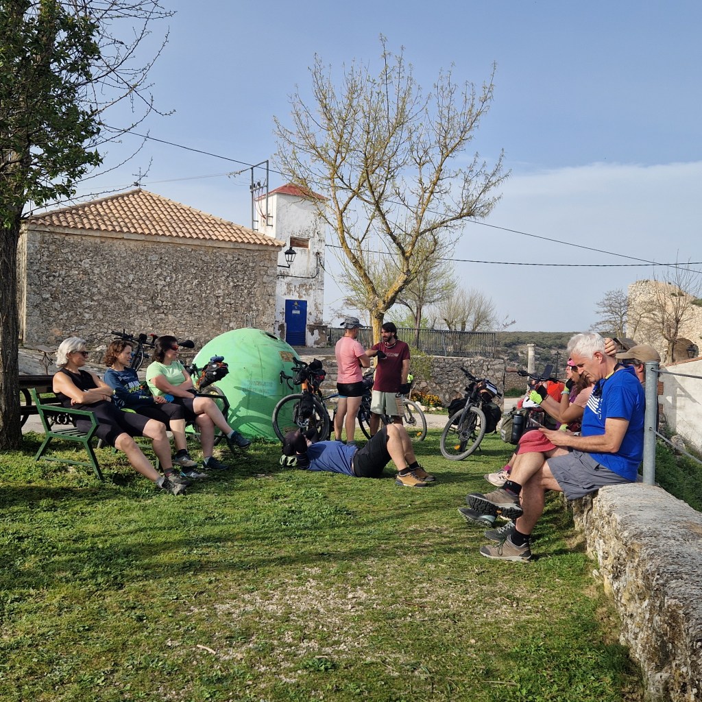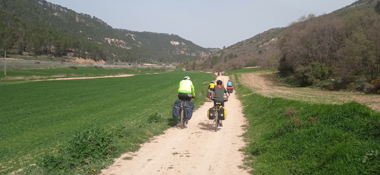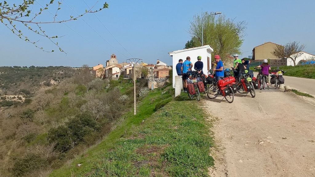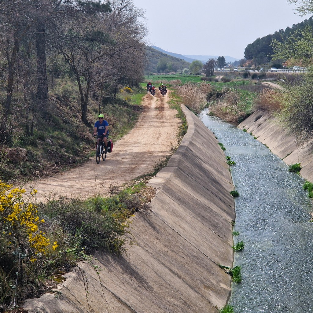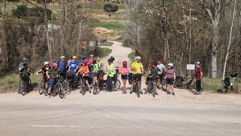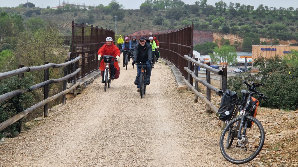 Todo empieza en la estación de Atocha, van llegando las bicicletas a los tornos. Reencuentro. Nos repartimos por los vagones, hace un día maravilloso de primavera. En Guadalajara nos reagrupamos, algunos que se escapan a tomar el café y algún churro a los bares cerca de la estación, y arranca el grupo. Larga serpiente de caballos de acero sobre ruedas. Que alegría estar juntos, pedalear. Hace fresco pero ya el día «pide» crema solar. Empezamos a adentrarnos en la Alcarria, después de pasar por el puente árabe de Guadalajara sobre el Henares. Bellos paisajes, aún aletargados excepto algún árbol despistado que ya ha florecido. Qué pena esa autopista A2 que nos vemos obligados a seguir durante varios kilómetros. Es lo que hay.