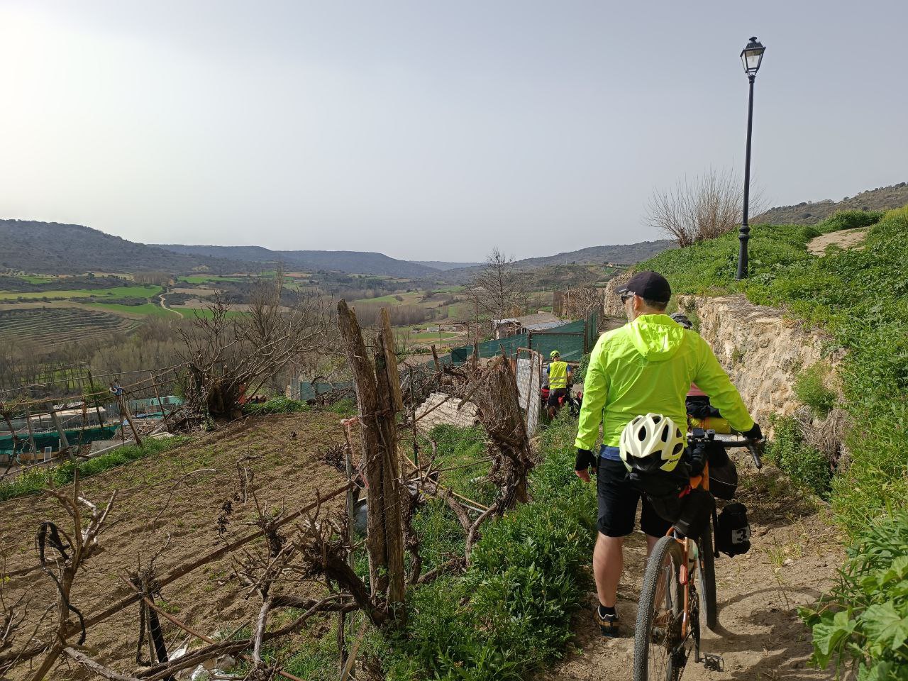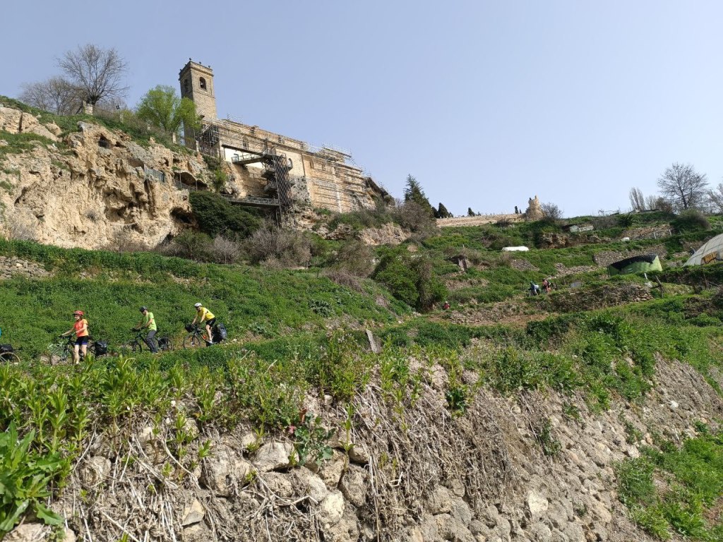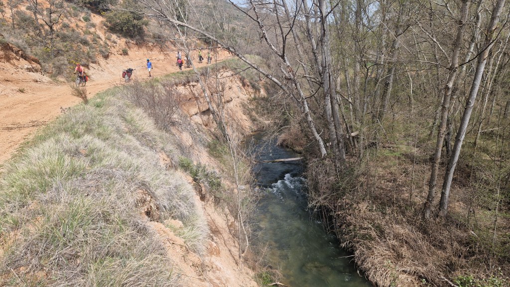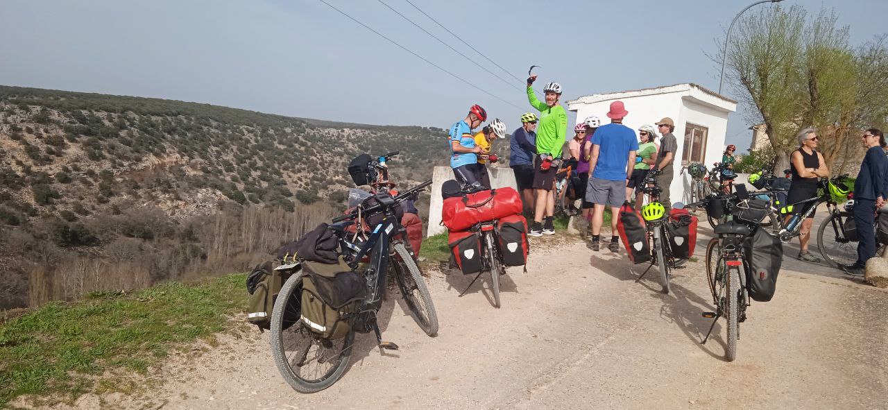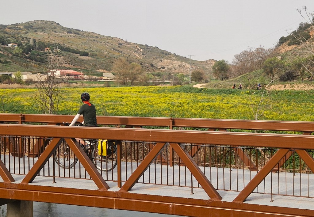 Todo empieza en la estación de Atocha, van llegando las bicicletas a los tornos. Reencuentro. Nos repartimos por los vagones, hace un día maravilloso de primavera. En Guadalajara nos reagrupamos, algunos que se escapan a tomar el café y algún churro a los bares cerca de la estación, y arranca el grupo. Larga serpiente de caballos de acero sobre ruedas. Que alegría estar juntos, pedalear. Hace fresco pero ya el día «pide» crema solar. Empezamos a adentrarnos en la Alcarria, después de pasar por el puente árabe de Guadalajara sobre el Henares. Bellos paisajes, aún aletargados excepto algún árbol despistado que ya ha florecido. Qué pena esa autopista A2 que nos vemos obligados a seguir durante varios kilómetros. Es lo que hay.