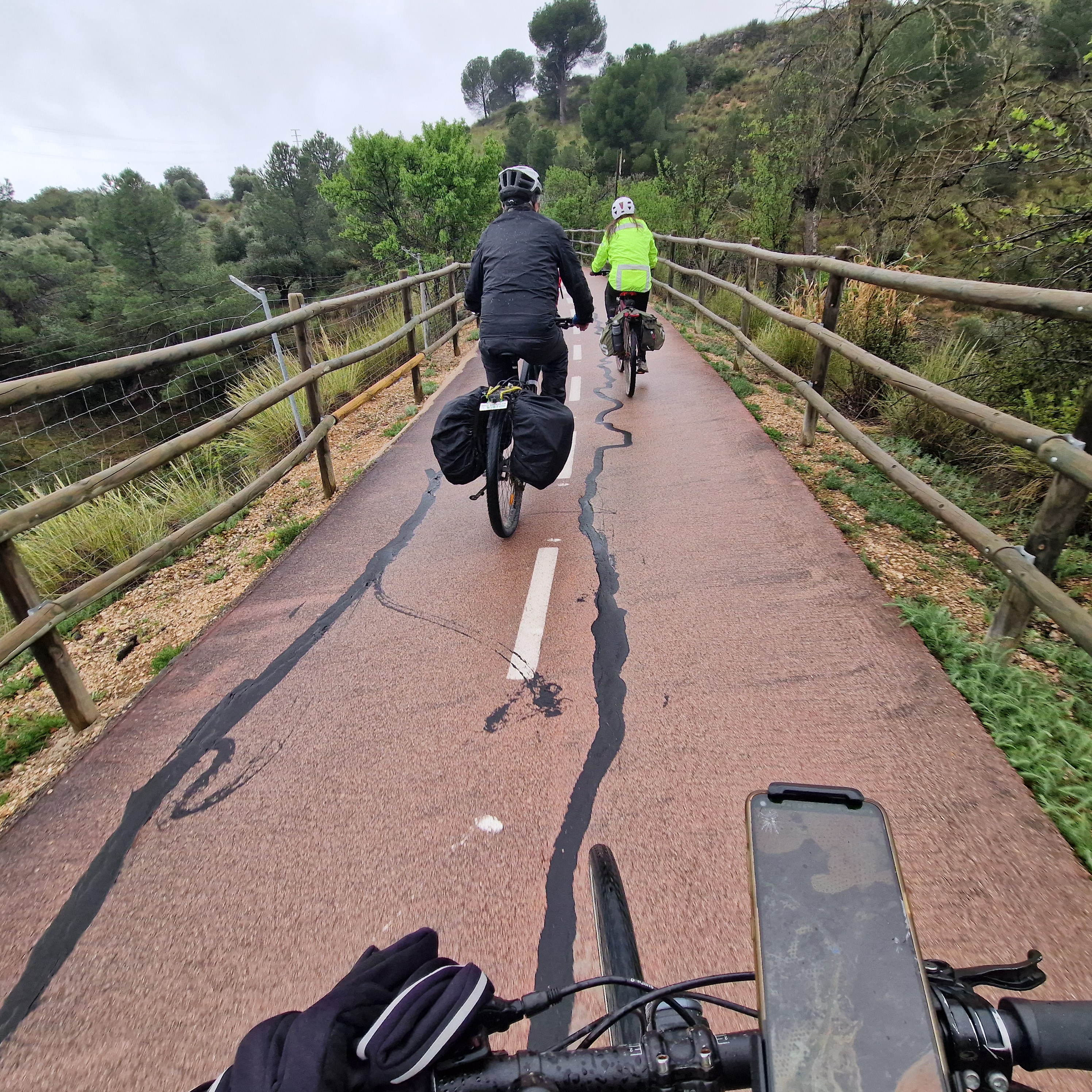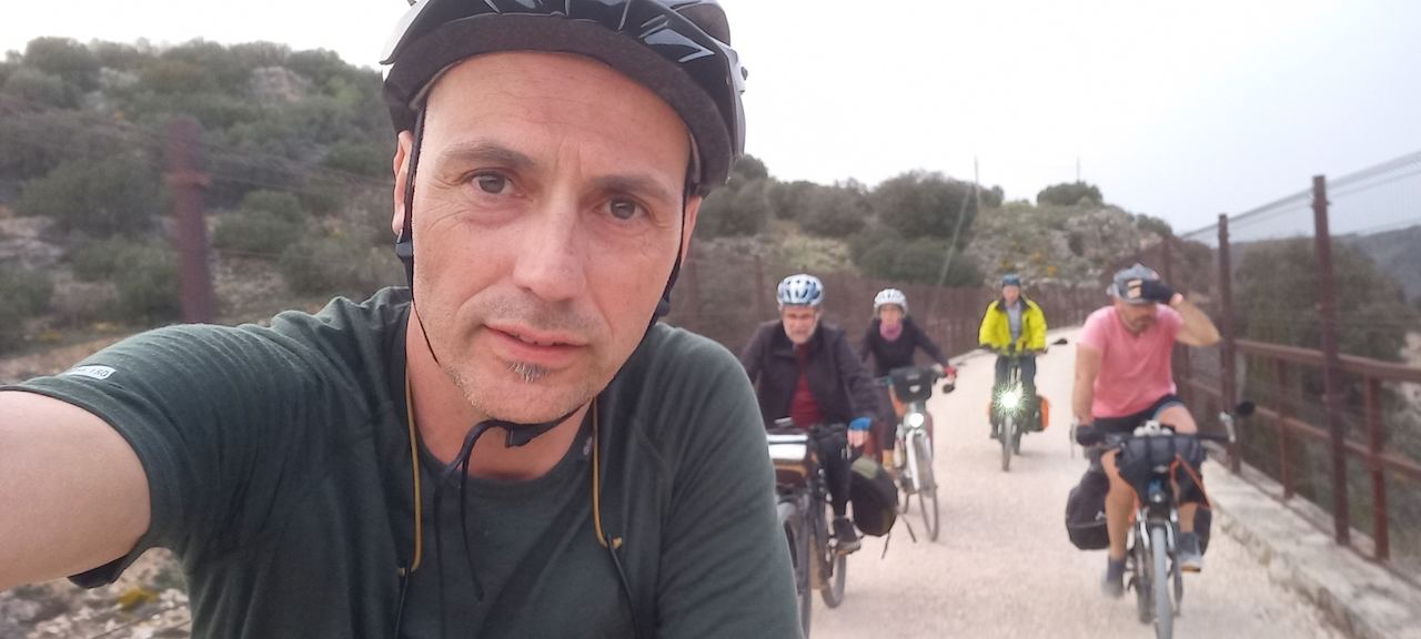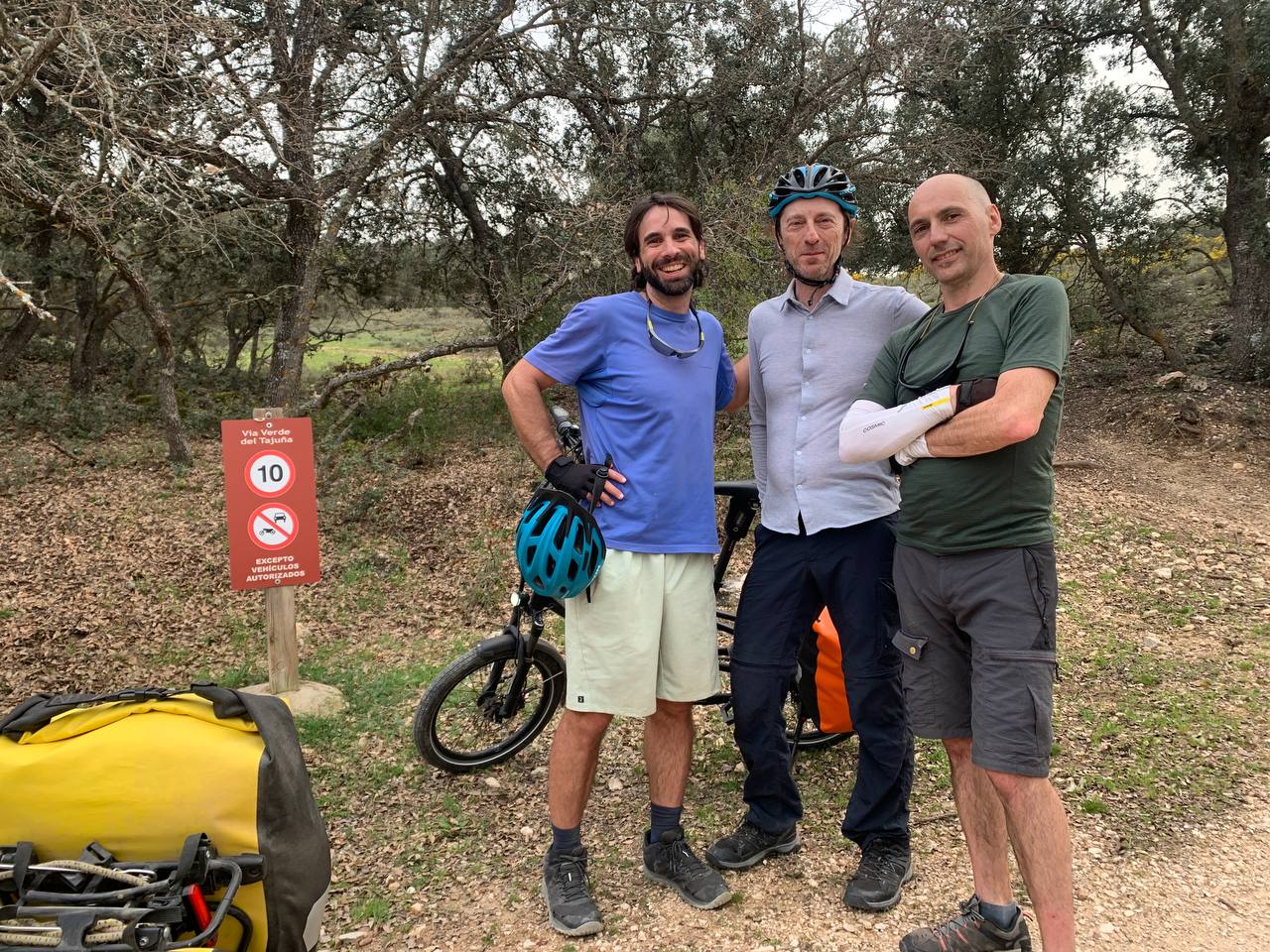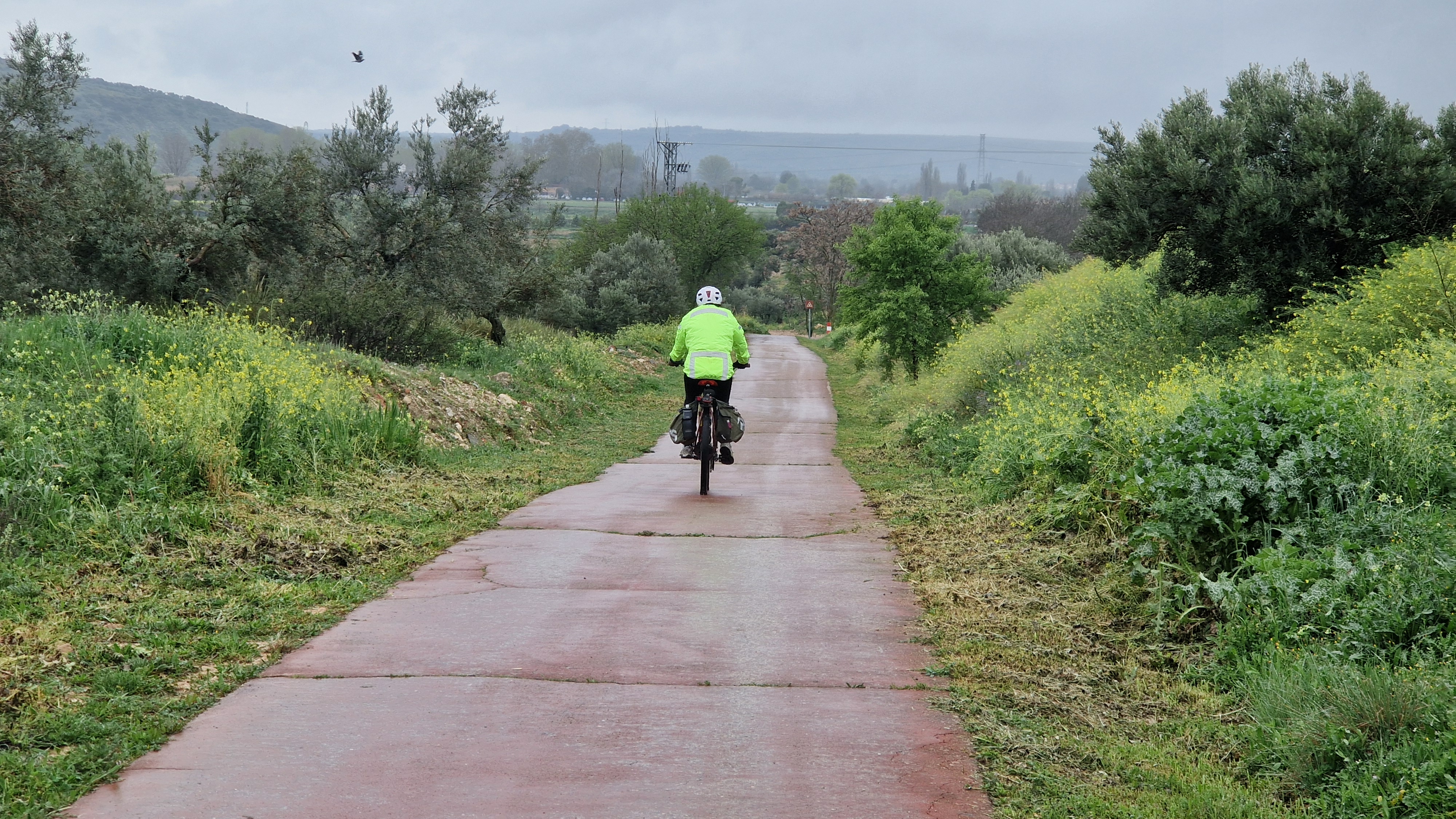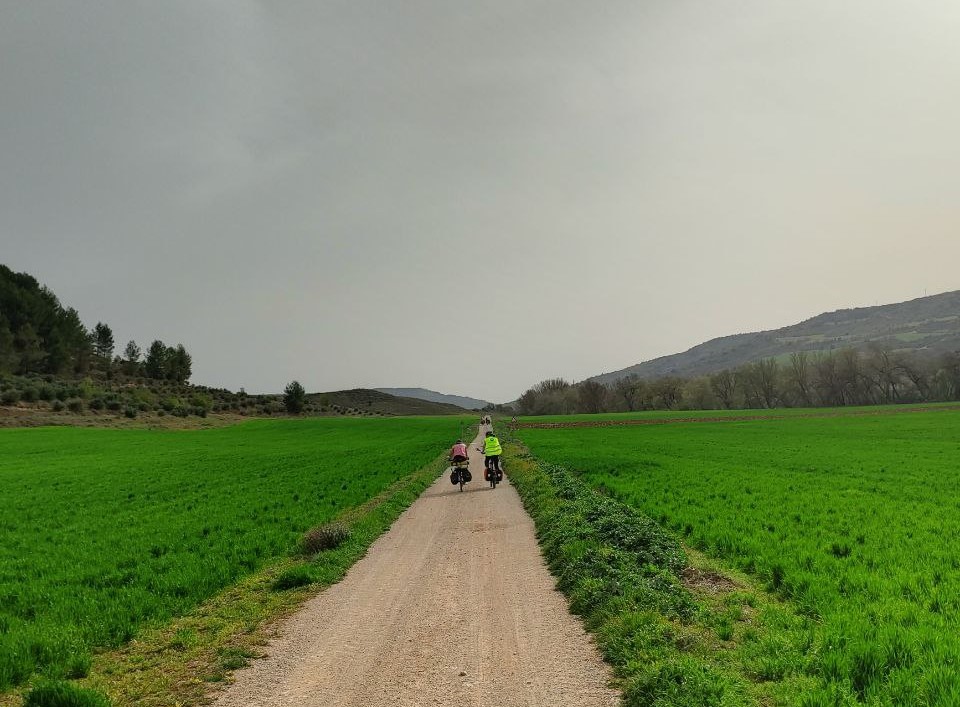 En la maravillosa Mondéjar desayunamos opíparamente. Nuestro destino final, Arganda. A las diez en punto, comenzamos a descender hacia el valle del Tajuña, a ritmo tranquilo, por la casi recién vía verde. Desde Ambite todo será pavimento, que agradecemos después de dos jornadas pedaleando principalmente sobre tierra. Algún que otro chubasco de camino, algún pinchazo, pero nada reseñable en contra de nuestros deseos por llegar en bicicleta al TFM de Arganda. En Tielmes hacemos una parada en el bar de la piscina donde probamos los deliciosos picatostes que allí se acompañan con el café y también, hay algún que otro encuentro de familiares que salen a nuestro paso. Sin parar y sin dejar de ver cada vez más florecillas, rodamos por los toboganes de Perales hasta Morata donde probaremos sus famosísimas palmeras. Después del avituallamiento de palmeras, torrijas y demás, ponemos rumbo a la cementera de Portland, en todo lo alto, en el páramo que nos separa de Arganda. Hace un día gris precioso que contrasta con el verde intenso de los campos de la flamante llegada de la primavera. El descenso hasta Arganda es el premio final a todos nuestros buenos momentos, a esto se suma, la estación de herramientas con ducha de agua incluida para lavar nuestras bicis antes de entrar en el TFM, que ha colocado el Exmo. Ayuntamiento de Arganda en el tramo final de la Vía verde. Muchas gracias.