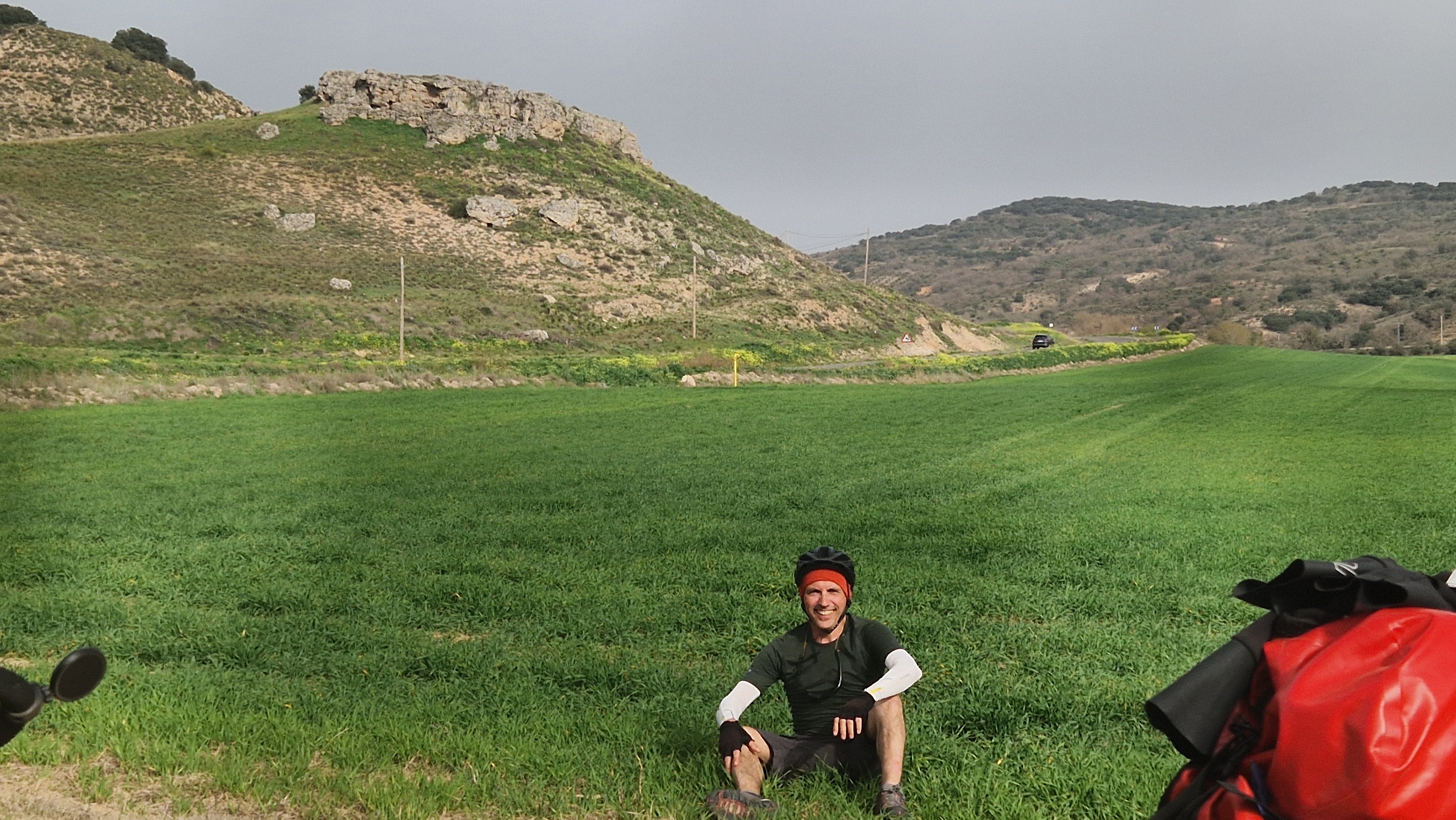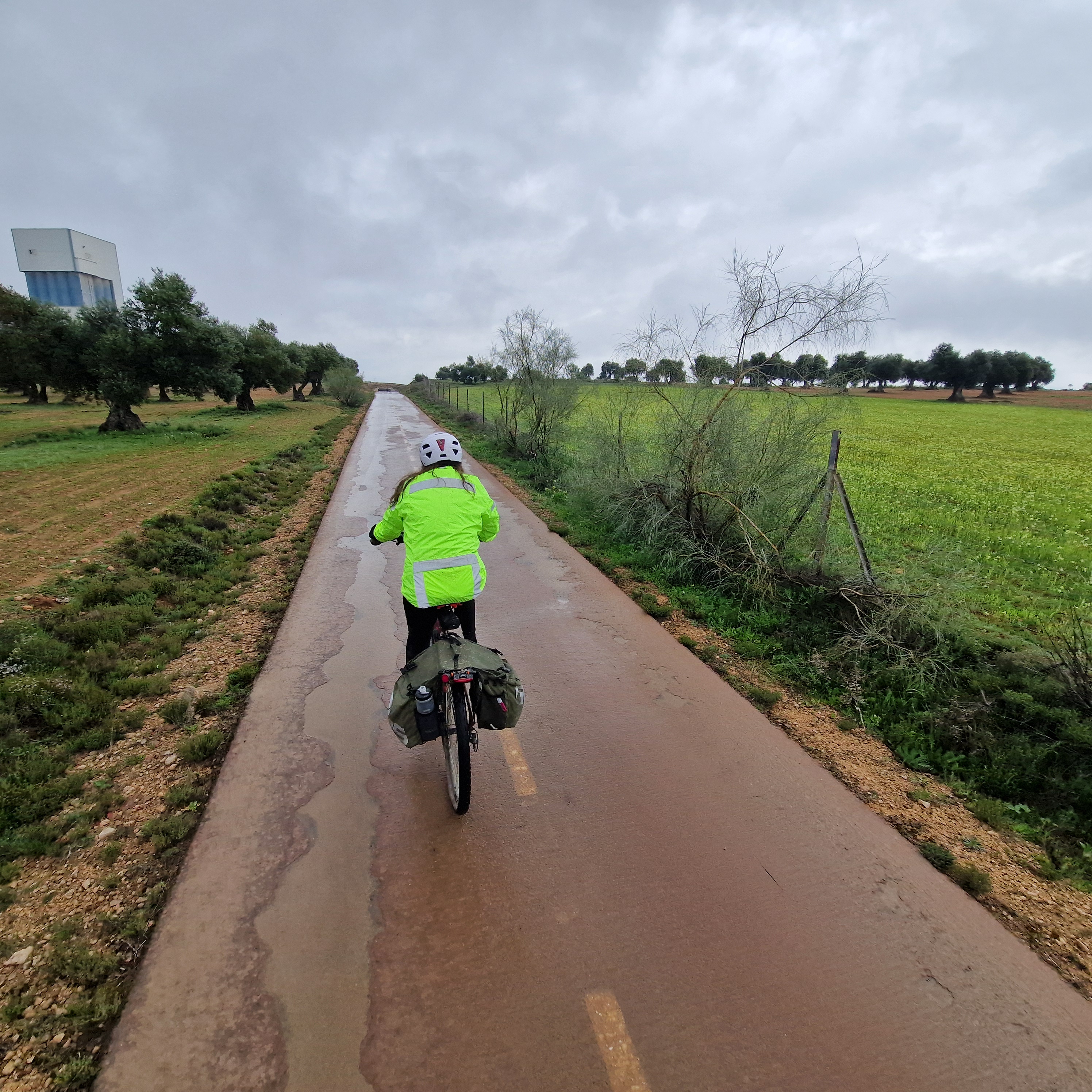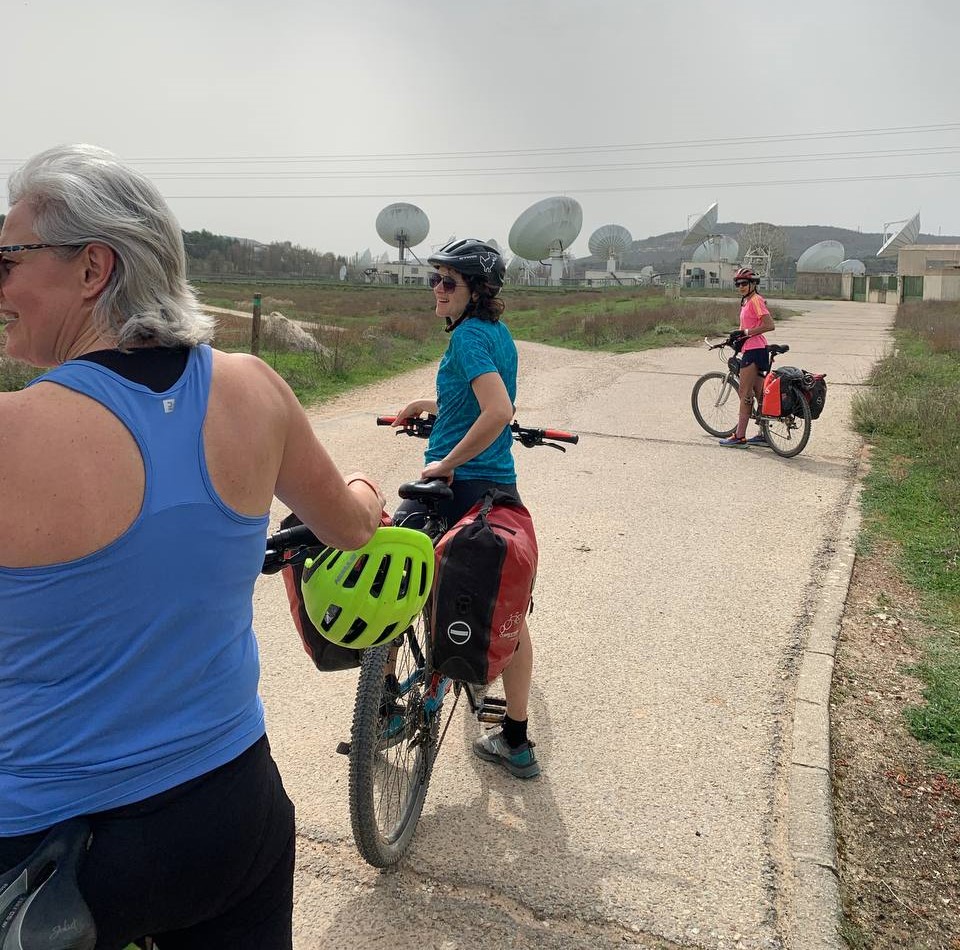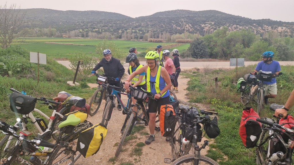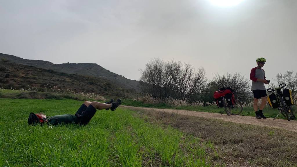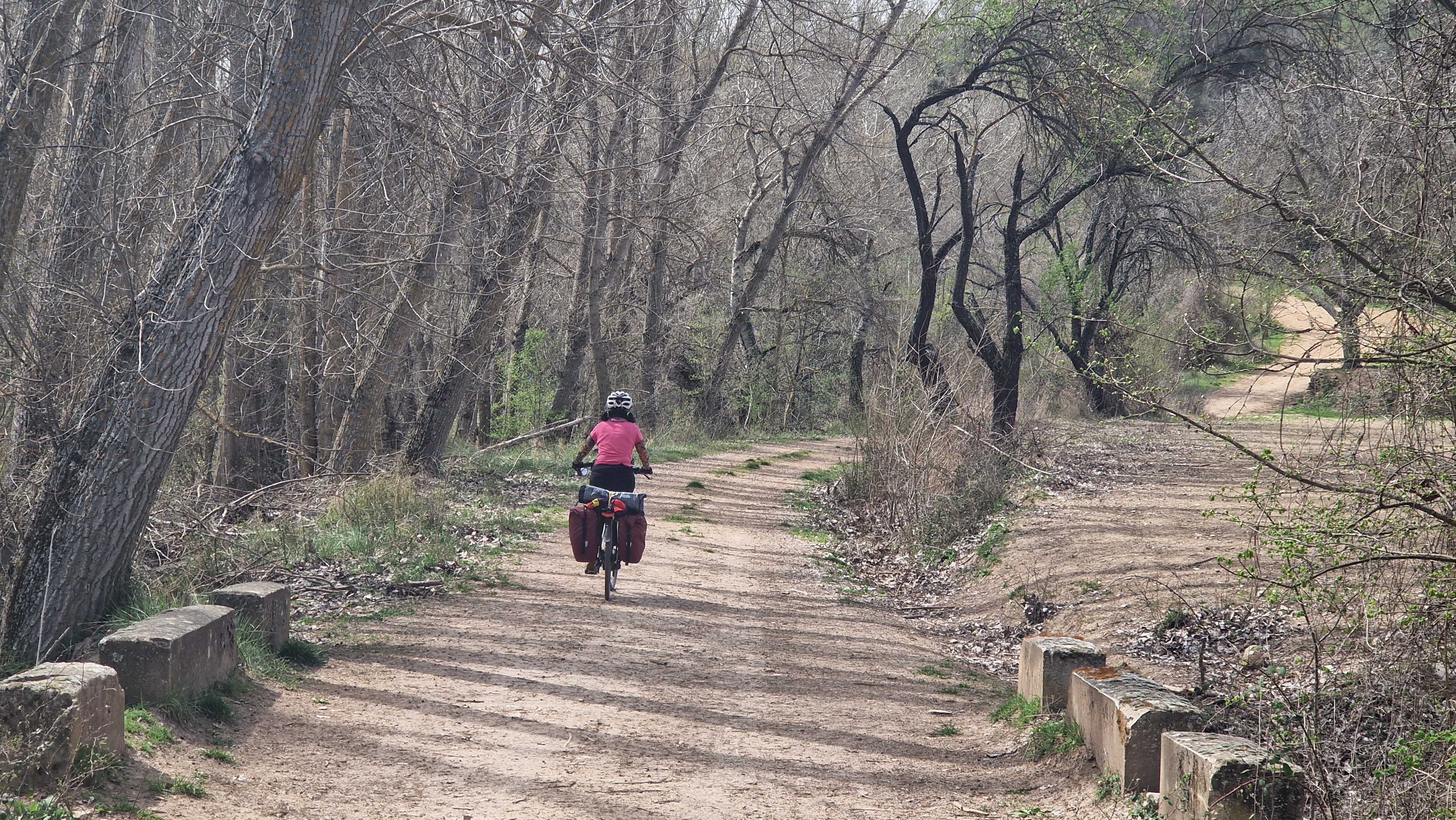 En la maravillosa Mondéjar desayunamos opíparamente. Nuestro destino final, Arganda. A las diez en punto, comenzamos a descender hacia el valle del Tajuña, a ritmo tranquilo, por la casi recién vía verde. Desde Ambite todo será pavimento, que agradecemos después de dos jornadas pedaleando principalmente sobre tierra. Algún que otro chubasco de camino, algún pinchazo, pero nada reseñable en contra de nuestros deseos por llegar en bicicleta al TFM de Arganda. En Tielmes hacemos una parada en el bar de la piscina donde probamos los deliciosos picatostes que allí se acompañan con el café y también, hay algún que otro encuentro de familiares que salen a nuestro paso. Sin parar y sin dejar de ver cada vez más florecillas, rodamos por los toboganes de Perales hasta Morata donde probaremos sus famosísimas palmeras. Después del avituallamiento de palmeras, torrijas y demás, ponemos rumbo a la cementera de Portland, en todo lo alto, en el páramo que nos separa de Arganda. Hace un día gris precioso que contrasta con el verde intenso de los campos de la flamante llegada de la primavera. El descenso hasta Arganda es el premio final a todos nuestros buenos momentos, a esto se suma, la estación de herramientas con ducha de agua incluida para lavar nuestras bicis antes de entrar en el TFM, que ha colocado el Exmo. Ayuntamiento de Arganda en el tramo final de la Vía verde. Muchas gracias.