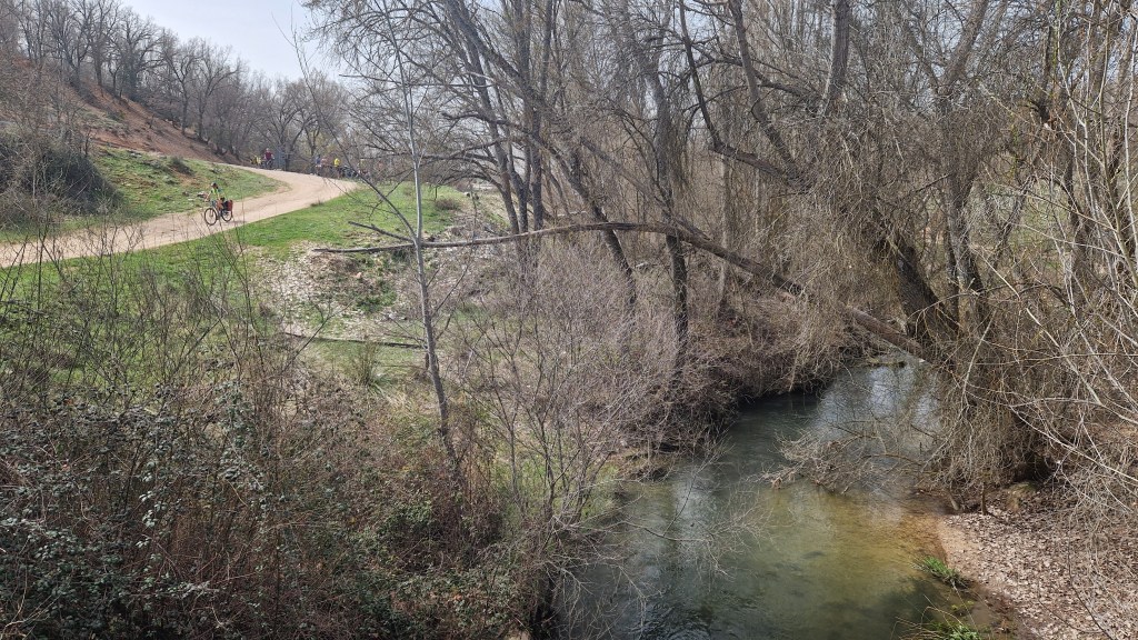 Después de un desayuno en el bar del hotel donde se alojaron algunos, empezamos a bajar por unos angostos y empinados caminos rodeados de huertas que iban dejando a la derecha la Iglesia y las murallas de Brihuega, para acabar en la vega del Tajuña. Seguimos este río, limpio y tentador, gran parte del día, por caminos rurales, pistas y algún tramo de carretera. Un día de primavera especial, con una calima que producía una luz extraña pero que permitía que el sol no quemara demasiado. Manzanos en flor, algunos ciruelos, pero la mayor parte de los quejigos y del resto de especies aún están por despertar.