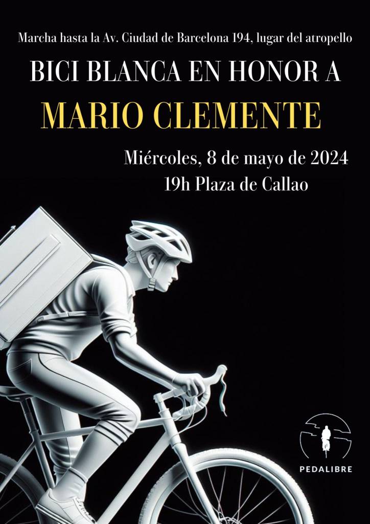 El miércoles 8 de mayo, recordaremos a Mario. Partiremos de Callao a las 19 h hacia el punto donde sucedió, lo que nunca debió suceder. Allí pondremos una Bici Blanca en su recuerdo y daremos voz a la familia, amigos y compañeros que deseen darle el último adiós.