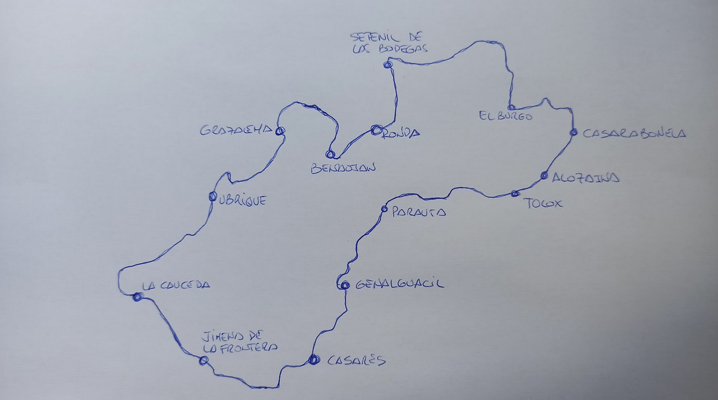 Una vez en Tolox, y por carreteras mayormente locales, y algún tramo de comarcal, nos dirigiremos al norte, pasando por Alozaina, Casarabonela, y al oeste hacia El Burgo, Cuevas del Becerro y Setenil de Las Bodegas para tomando hacia el sur retornar a Ronda pasando por Arriate.