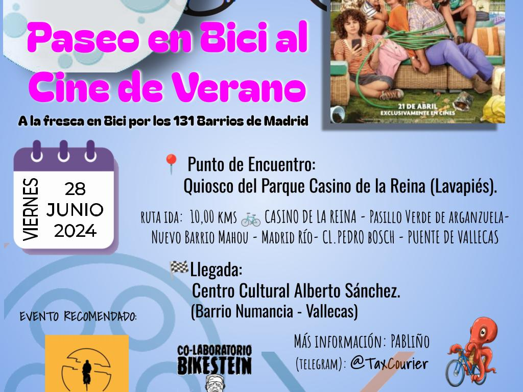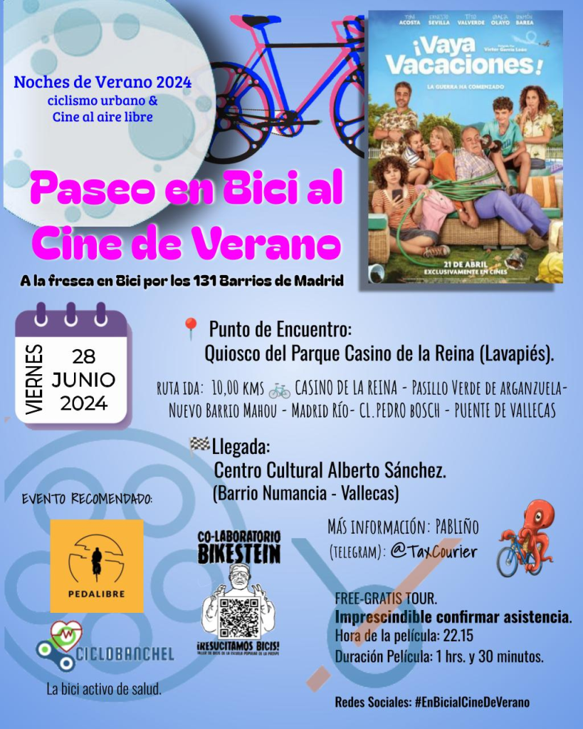 Este viernes, en colaboración con Ciclobanchel y el Col-Laboratorio Bikestein, empezamos con los paseos en bici al cine de verano 2024.