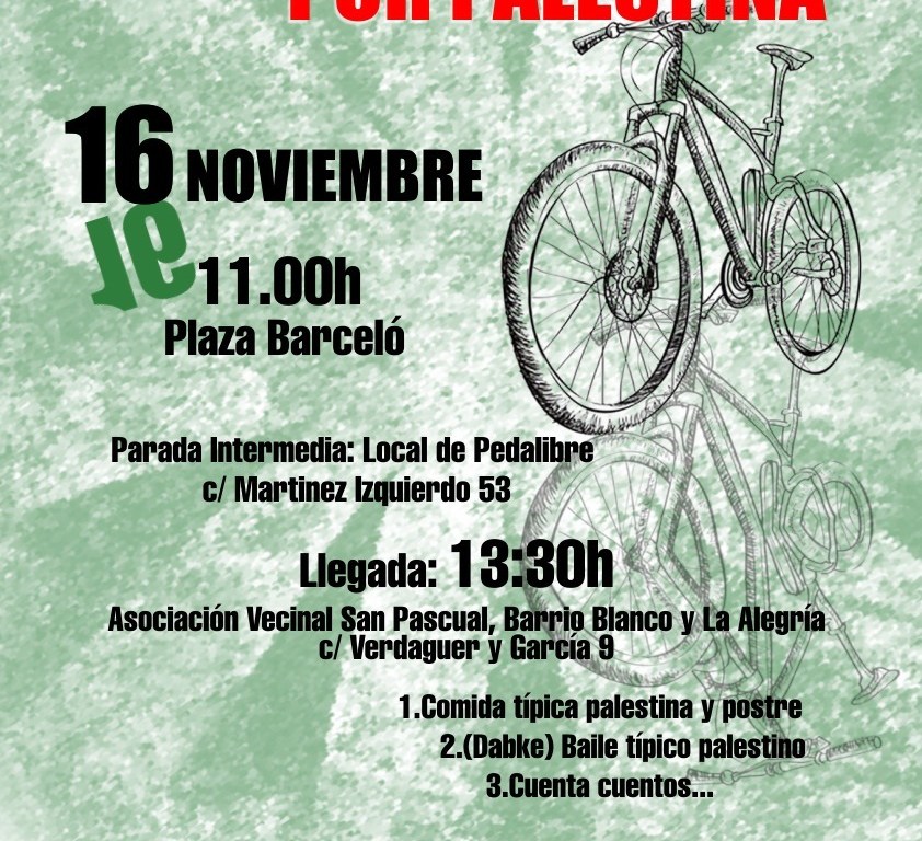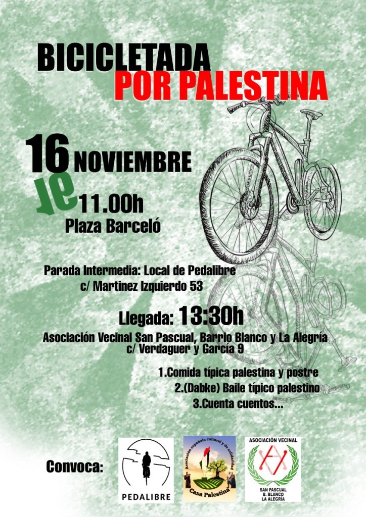 El sábado 16 de noviembre, Pedalibre, una vez más, se solidarizará con el sufrimiento del pueblo palestino y organizará, junto a Casa Palestina y la Asociación Vecinal de San Pascual, Barrio Blanco y La Alegría, un acto para recaudar fondos derivados a dicha causa. Bicicletada, comida, baile y cuentacuentos serán las actividades de las que podrán disfrutar los participantes.