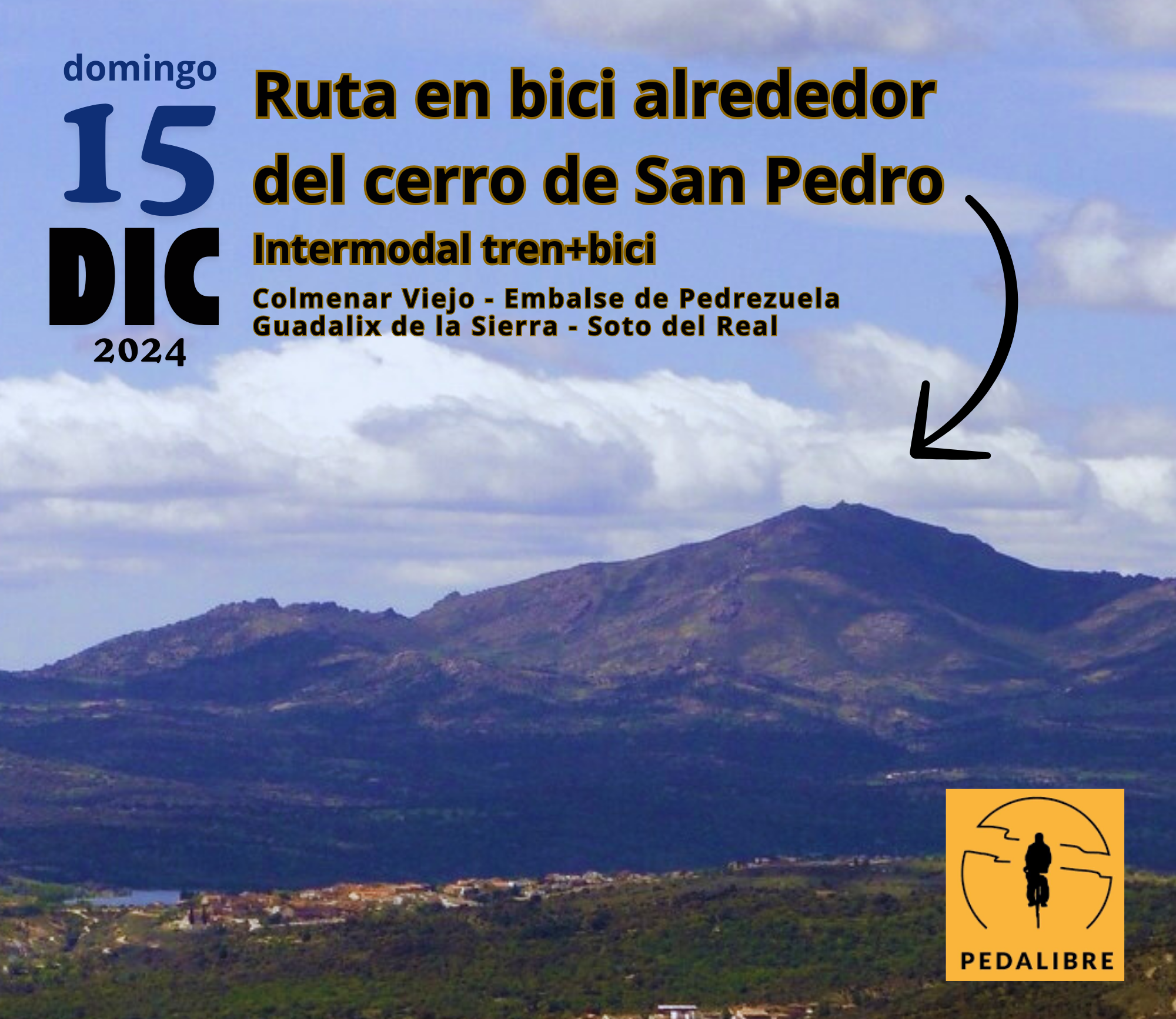 Ruta intermodal de aprox. 50 km, en bici desde Colmenar Viejo rodeando el cerro testigo de San Pedro hasta al embalse de Pedrezuela, Guadalix de la Sierra, Soto del Real y vuelta a Colmenar Viejo. Esta ruta fue suspendida por inclemencias meteorológicas (aviso amarillo de la AEMET) el pasado 08 de diciembre y se sustituyó por la Madrid-Parla.