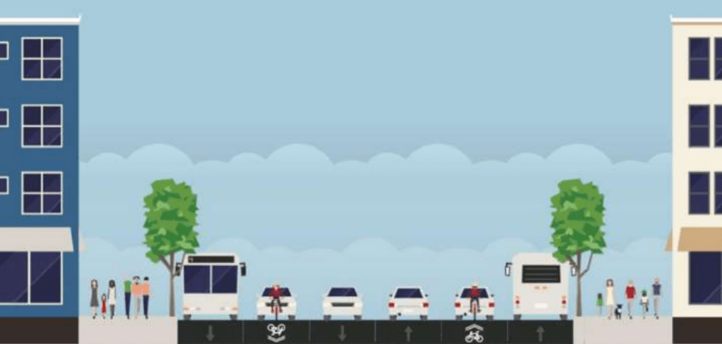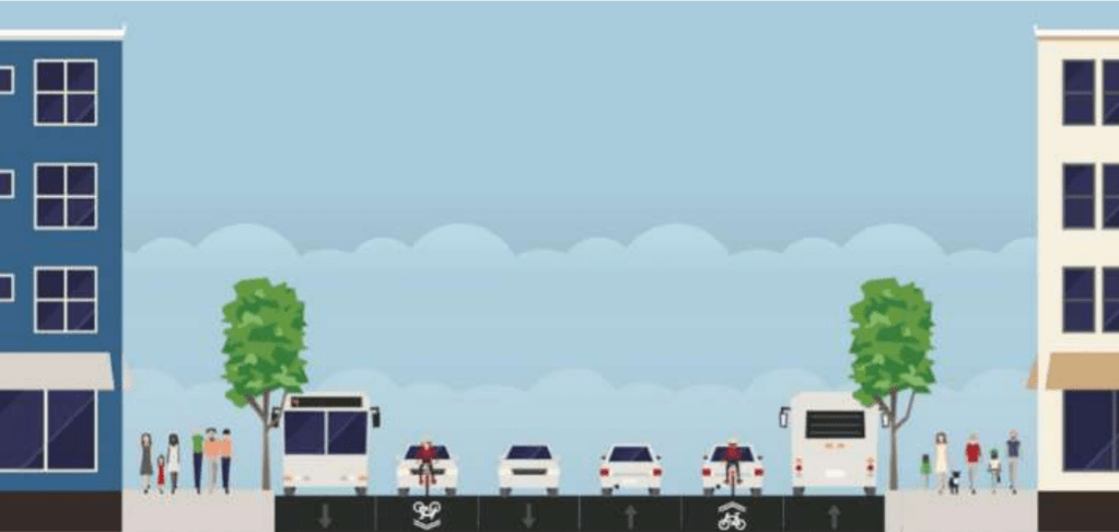 Según la cual, y tomando como referencia una de las secciones tipo que aparecen en el documento, podemos hablar de 3 diferentes escenarios según la mayor o menor apuesta por la movilidad sostenible. Todos ellos, comparten características comunes como que alejan la contaminación sonora y atmosférica de las viviendas y pacifican el tráfico motorizado por la reducción del ancho de sus carriles.