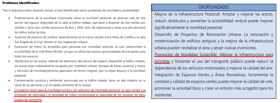 Aun reconociendo el avance y las mejoras de la propuesta, gracias en parte al continuado esfuerzo de las asociaciones vecinales del distrito, sorprende la ausencia de infraestructura ciclista, toda vez que este estudio identifica como problema detectado la “circulación hostil para la movilidad ciclista y VMP por el caso omiso a la limitación de velocidad y la densidad de tráfico que compromete la seguridad de los usuarios de estos modos de transporte” y califica de oportunidad la “promoción de la movilidad sostenible” entre la que incluye “la mejora de la infraestructura ciclista para reducir la dependencia de los vehículos motorizados y mejorar la calidad del aire“.