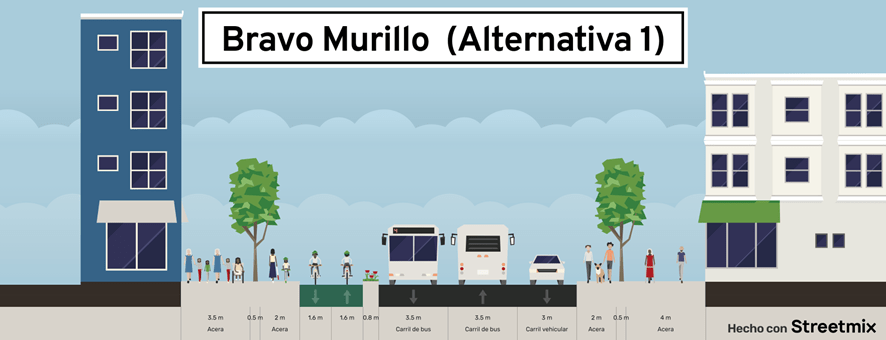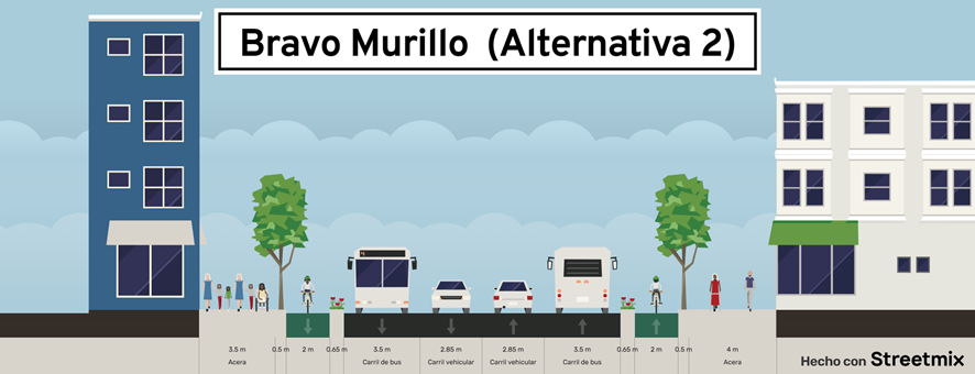 Esta solución añade un espacio relevante a ambas aceras y, además de elevar la capacidad peatonal y ofrecer espacio suficiente para más árboles o elementos de calidad estancial como fuentes, bancos, etc. propone una vía ciclista con una sección generosa que prolongaría la de Santa Engracia. Asimismo, asegura los dos sentidos de los autobuses y reduce de forma muy relevante la intensidad del tráfico motorizado privado dejando un solo carril sentido sur-norte y distribuyendo el contrario hacia el Paseo de la Castellana, Infanta Mercedes, Orense, etc. (lado oeste) y Ofelia Nieto, Jerónima Llorente o Pablo Iglesias (lado este). Una propuesta similar coincide con el proyecto Bravo Murillo Amable que presentó el grupo Más Madrid en 2021