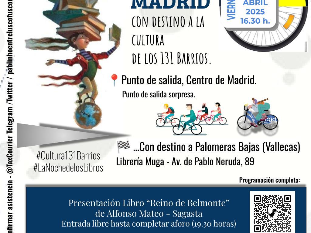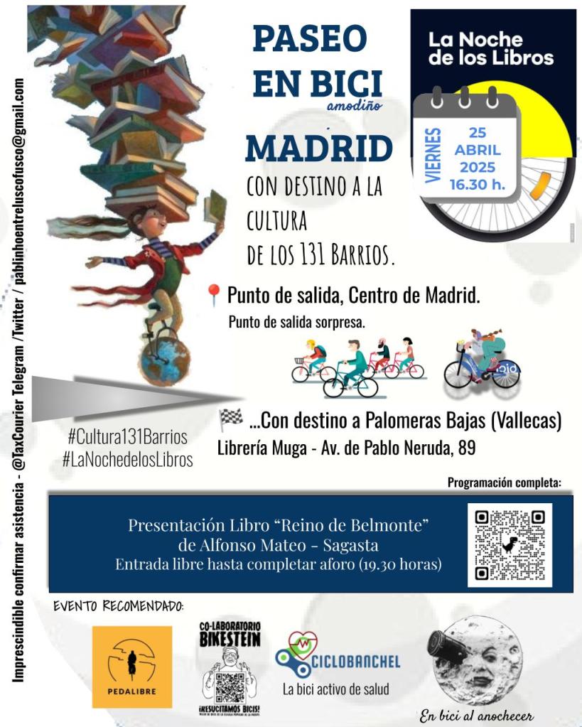 El plan es un paseo en bici 🚲 escapando del Centro, ratoneando por el Madrid Río y los tramos del Anillo Ciclista del Parque Forestal de Entrevías para visitar el Barrio de Palomeras Bajas (Vallecas), y con 🏁 en la Librería Muga. Aproximadamente 15 kms. 🚴🚴♀️🚴♂️