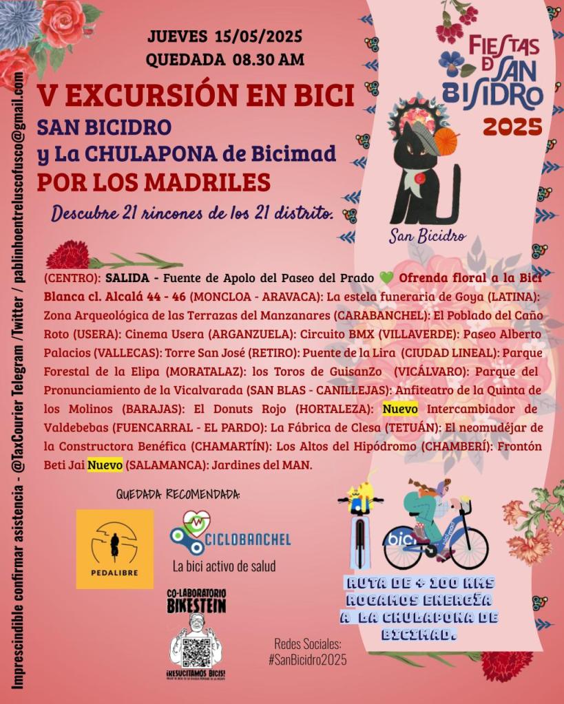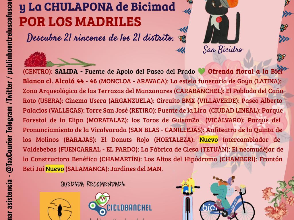 Tras una ofrenda floral a la Bici Blanca 💮🌺visitaremos algunos de los sitios con encanto 💚y novedades del año😲 de los distritos de la ciudad de Madrid 🚴♂️. Un paseo tranquilo pero con más de 100 Km que tal vez alguno termine con la bendición 🙏 de San Bicidro y la Chulapona de Bicimad.