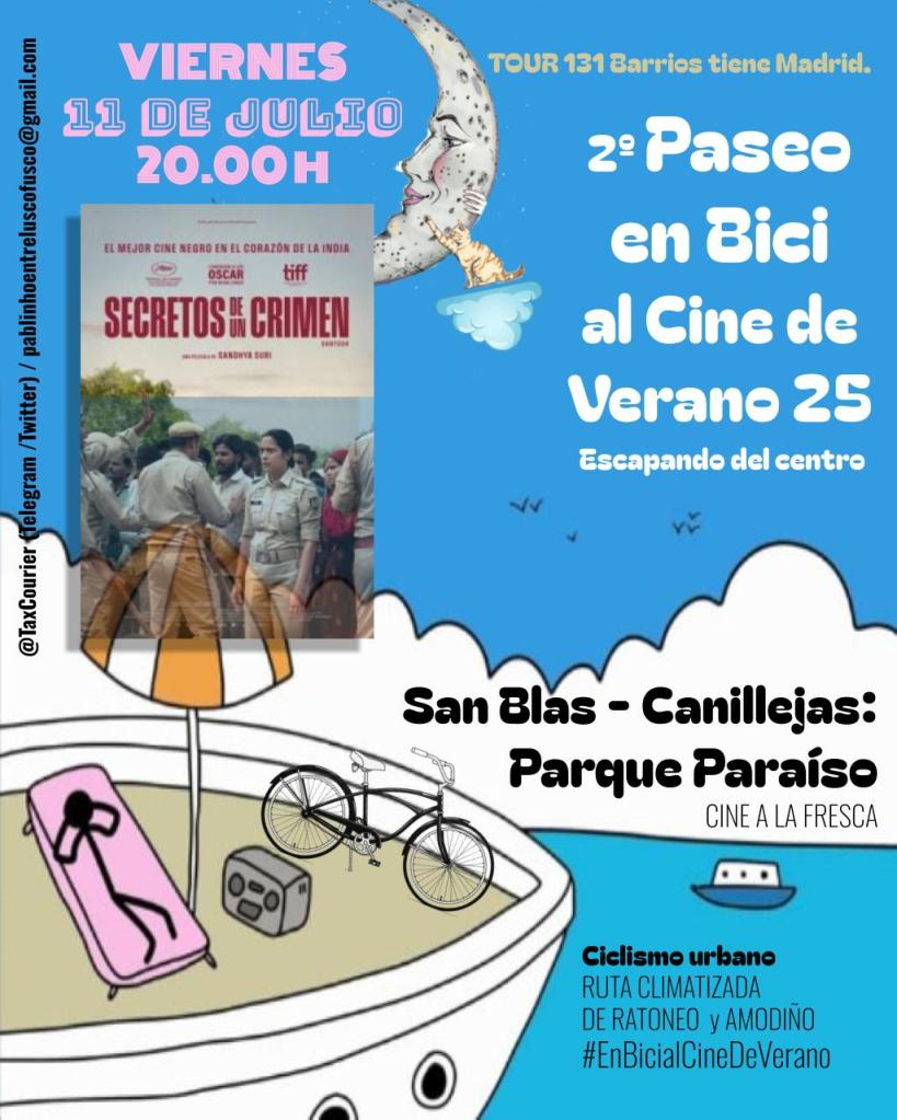 📣 Este viernes 11 de julio, 2º paseo #EnBicialCinedeVerano 2025, tour 131Barrios tiene Madrid. 🚴♂️Ciclismo urbano 🚴♀️ escapando del Centro bajo la luz de la luna de los Veranos de la Villa ➕ Cine 🎞 a la fresca con destino Parque del Paraíso (San Blas – Canillejas) para ver Secretos de un Crimen.