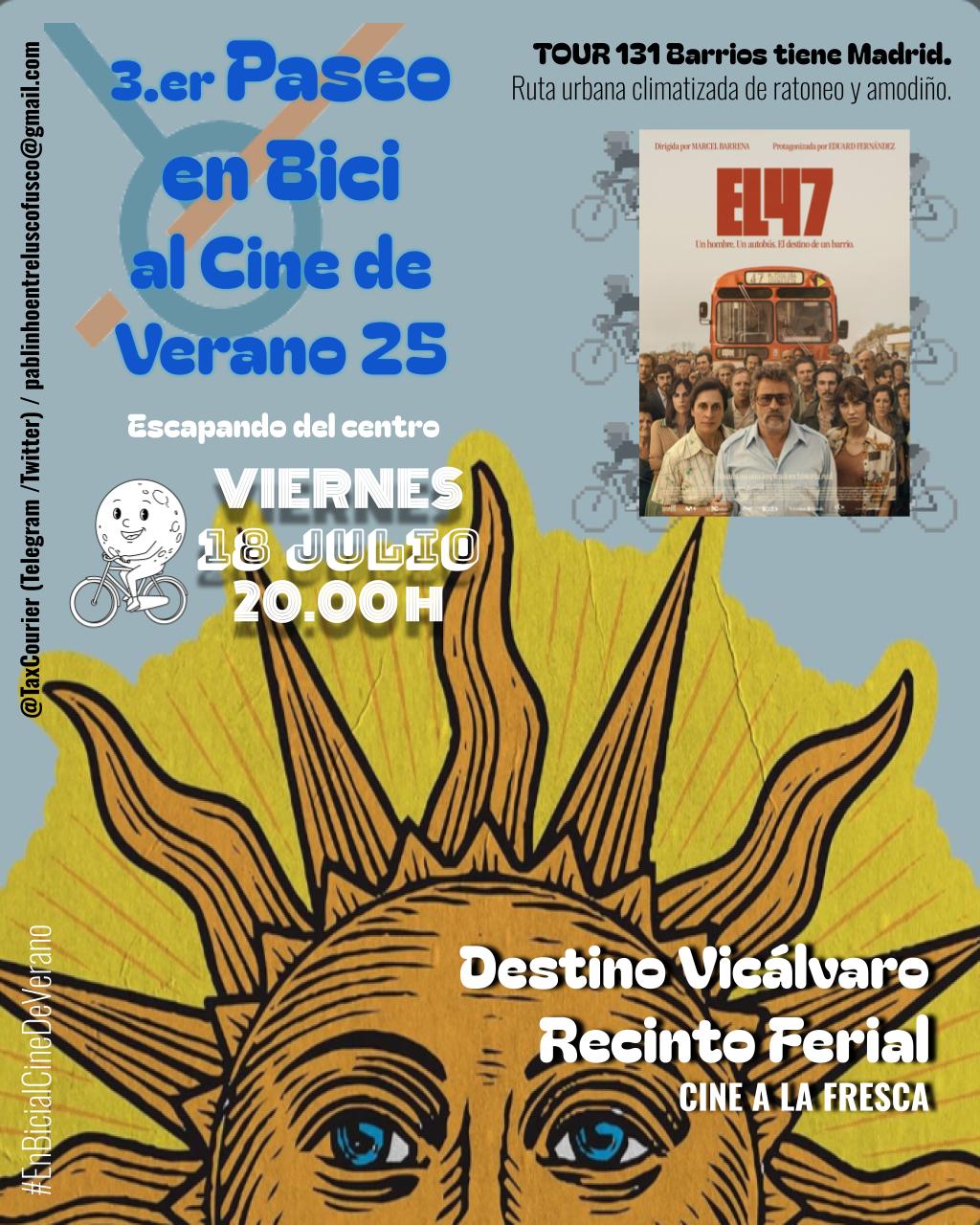 📣 Este viernes, 18 de julio, tercer paseo del Tour en Bici al Cine de los 131 Barrios de Madrid. 🚴♂️