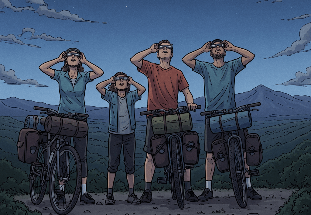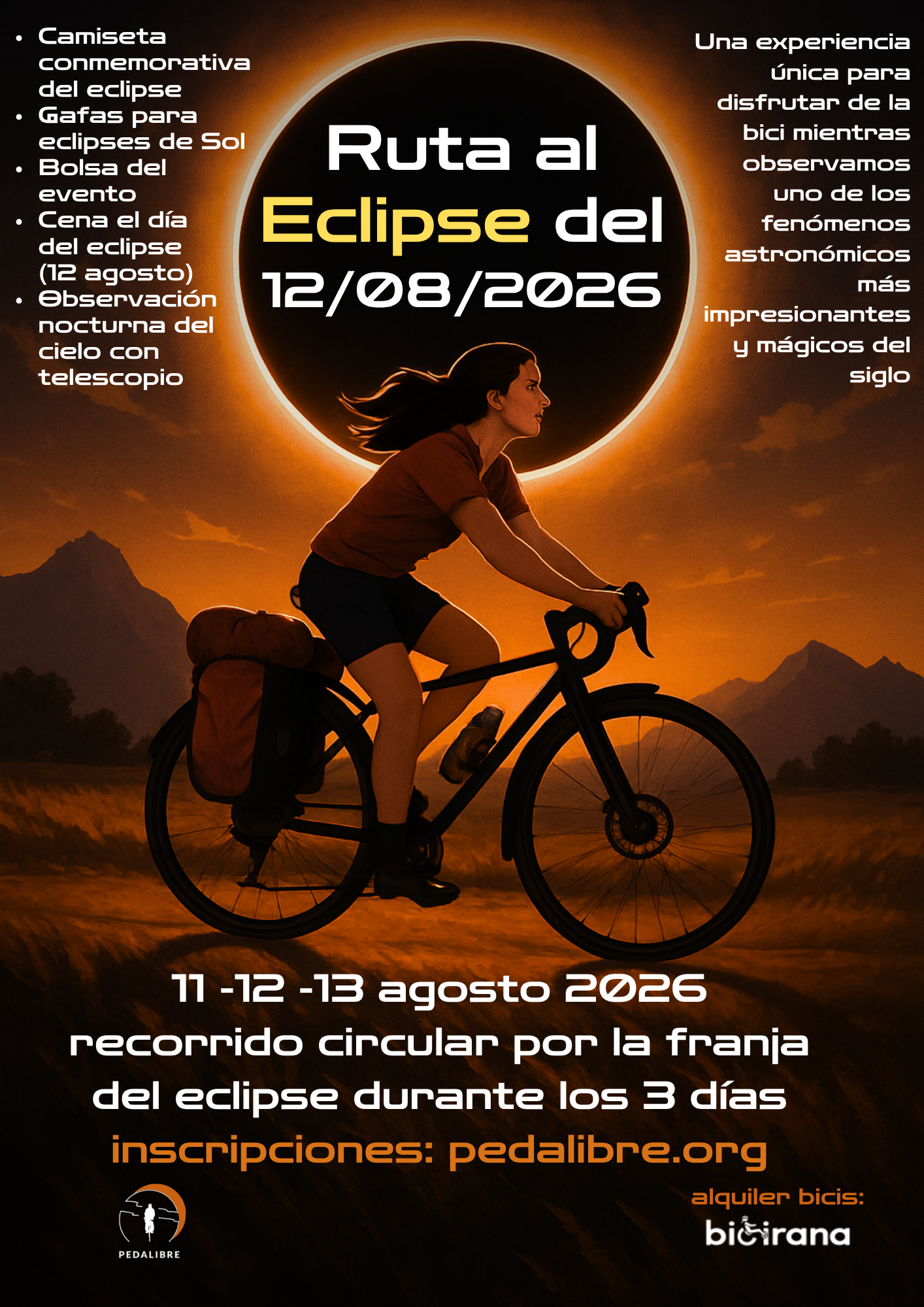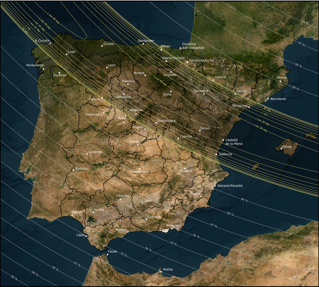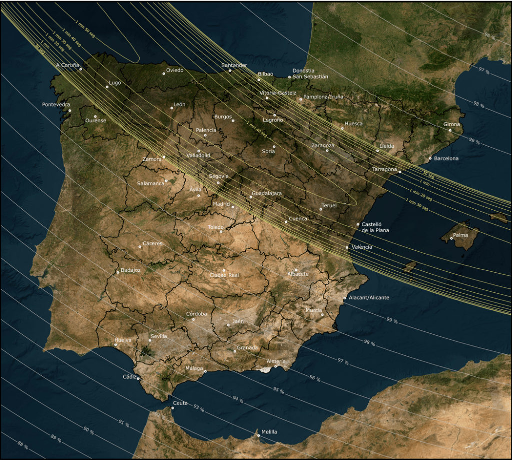 La franja de totalidad de este eclipse cruzará la península de oeste a este y sucederá cuando el Sol se esté poniendo muy cerca del horizonte. Ello obligará a observar el eclipse desde un lugar con buena visibilidad. Al suceder en verano, las probabilidades de tener un cielo despejado son altas en una gran parte del país, por eso invitamos a los entusiastas de la bici y de la astronomía a ser parte de una experiencia única: disfrutar de la bici mientras observamos uno de los fenómenos astronómicos más impresionantes y mágicos del siglo.