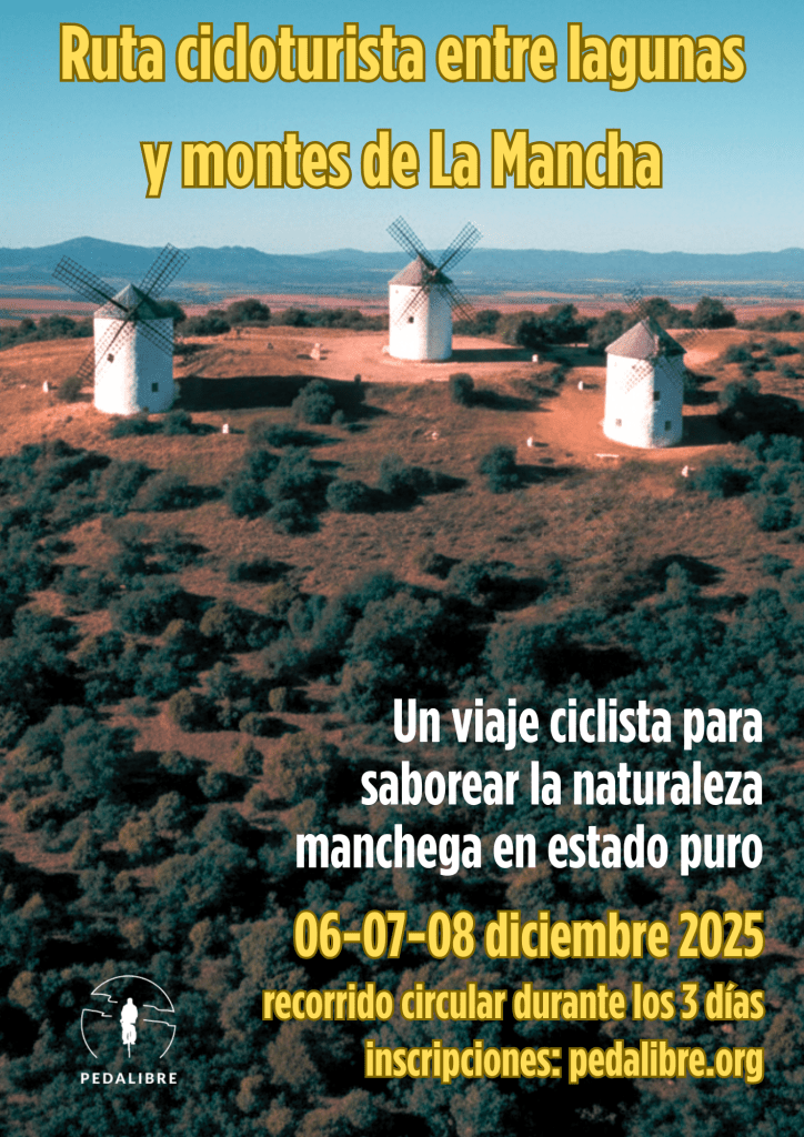 Un viaje ciclista para saborear la naturaleza manchega en estado puro: tres días pedaleando a ritmo tranquilo en el final del otoño, entre lagunas, llanuras y montes, en convivencia y autosuficiencia, sin ataduras de tiempo ni prisas. Así es nuestra propuesta para el puente de diciembre de 2025 (6, 7 y 8), atravesando los paisajes de Ciudad Real y Toledo (fotos y vídeos de la ruta las publicamos al final de esta entrada)
