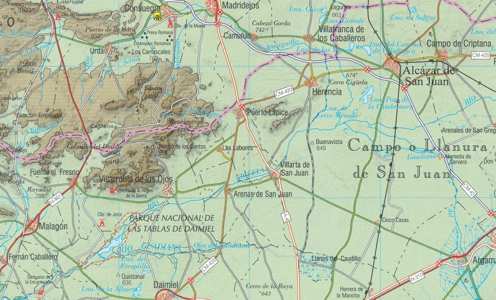 Desde Puerto Lápice nos adentraremos en los Montes de Toledo, una cordillera de perfil apalachense que separa las cuencas del Tajo y el Guadiana, y cuyo paisaje alterna valles, sierras suaves y manchas de monte mediterráneo. Subiremos por la Sierra de la Cueva hasta alcanzar el Puerto de los Santos, disfrutando de encinas, jaras, romero y vistas abiertas. Descenderemos hacia las vegas del río Cigüela y llegaremos a Villarrubia de los Ojos, al pie de una sierra, junto a los manantiales y humedales que nutren las Tablas de Daimiel. - Día 3 (8 diciembre): Villarrubia de los Ojos – Villafranca de los Caballeros (34 km)