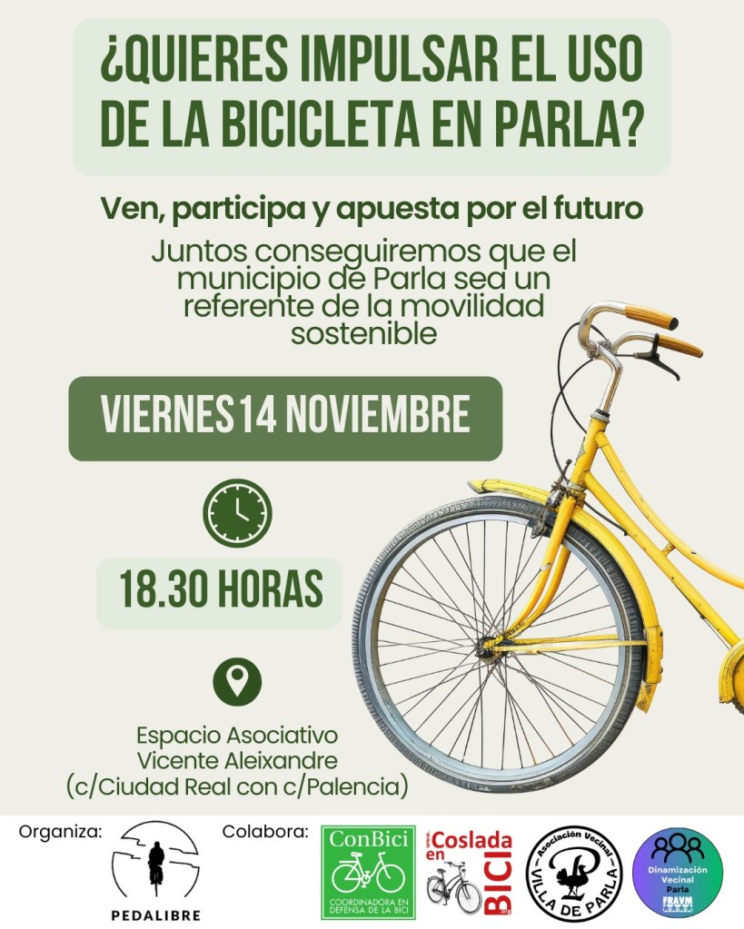 El próximo viernes, 14 de noviembre, a las 18:30 , te invitamos a una asamblea informativa para hablar sobre la bicicleta en Parla. Juntos, compartiremos ideas y valoraremos la creación de una plataforma ciudadana o asociación para promover el uso de la bicicleta en nuestro municipio.