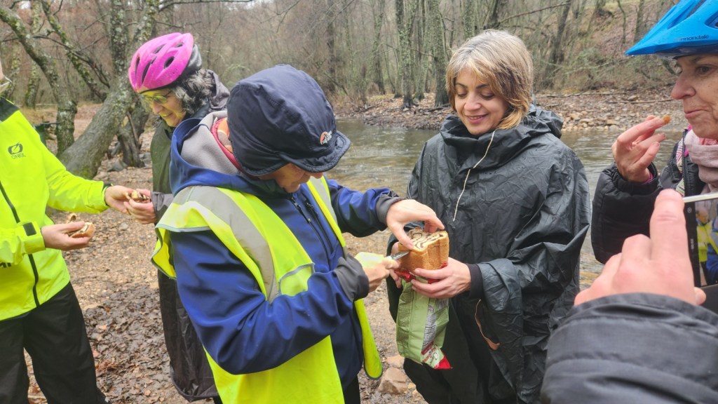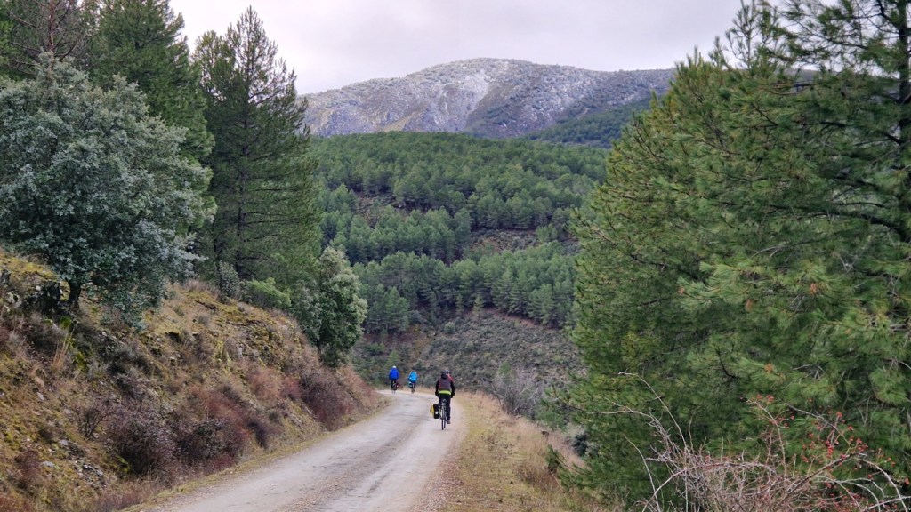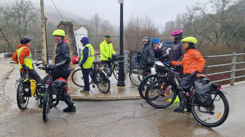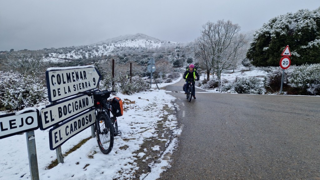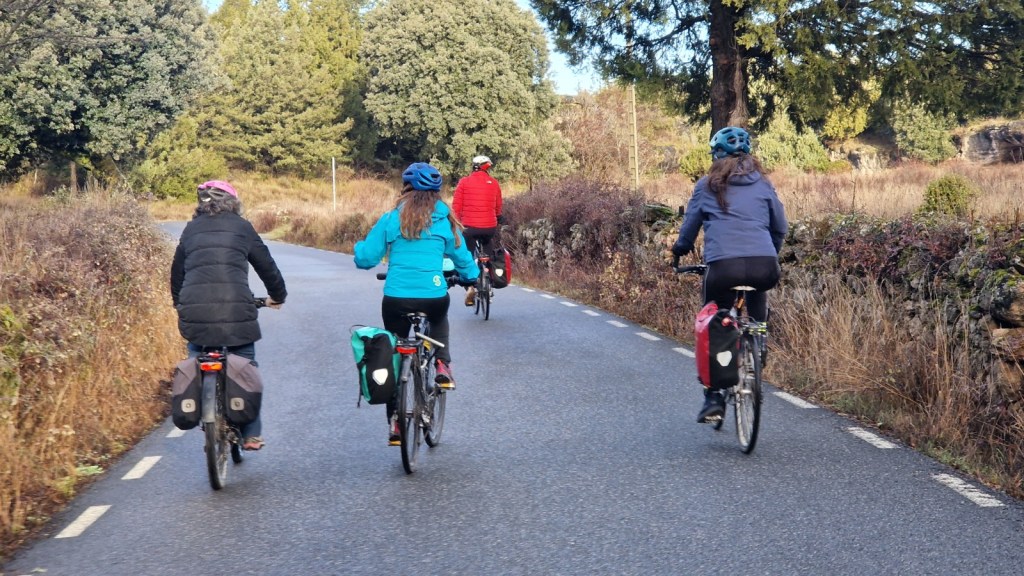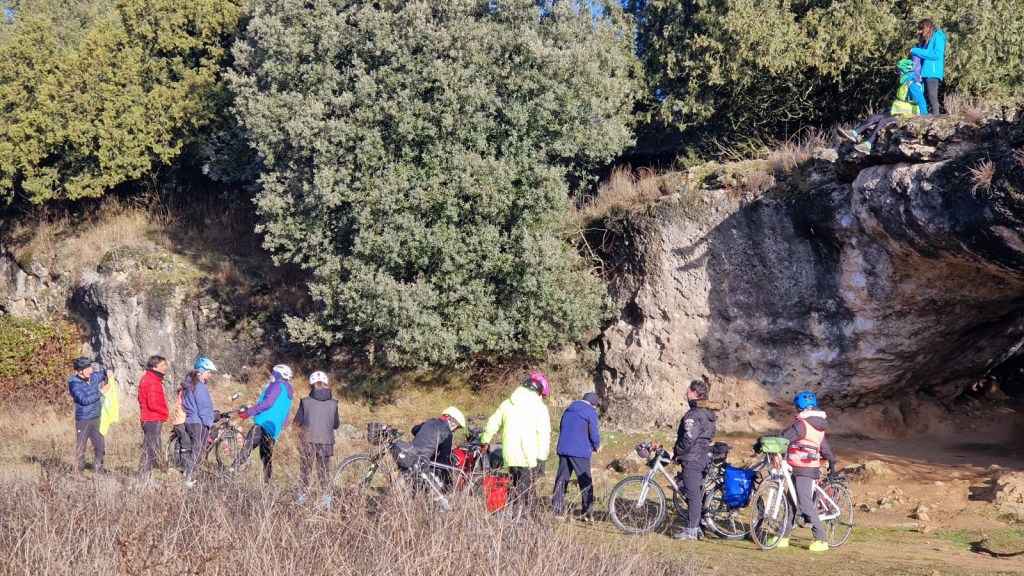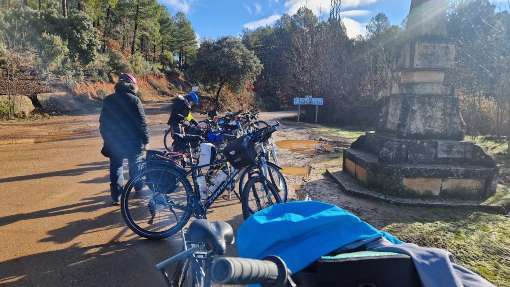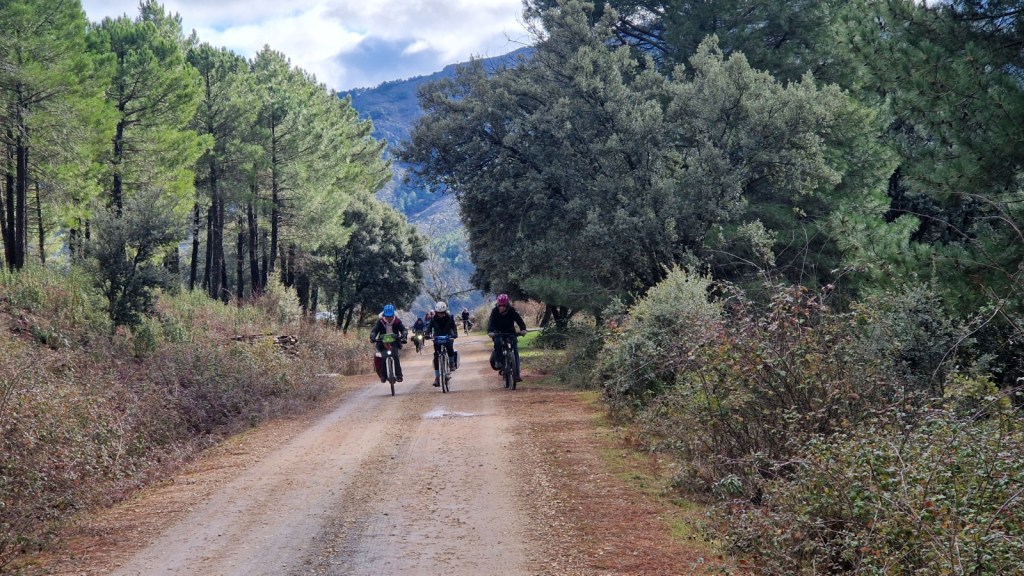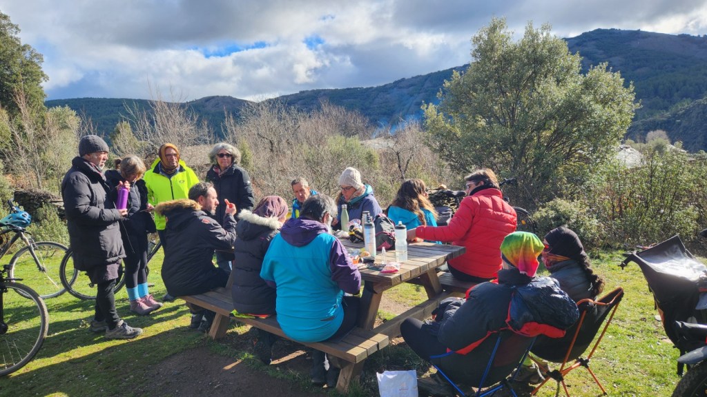 El protagonista inesperado fue el manto blanco: nos tocó ciclar sobre nieve cuajada por encima de los 1.200 metros, añadiendo un punto de épica a cada pedalada. Finalmente, todos los caminos condujeron al Monasterio de Bonaval (aprox. 850 m), donde el grupo se reunificó rodeado de historia cisterciense. Tras el esfuerzo, repusimos fuerzas comiendo a orillas del río Jarama, cerca de Retiendas (890 m), antes de dirigirnos a Tamajón (1.030 m) para la pernocta y el merecido descanso.