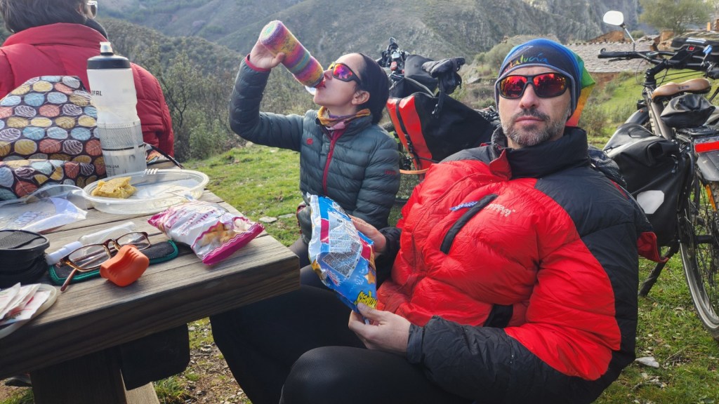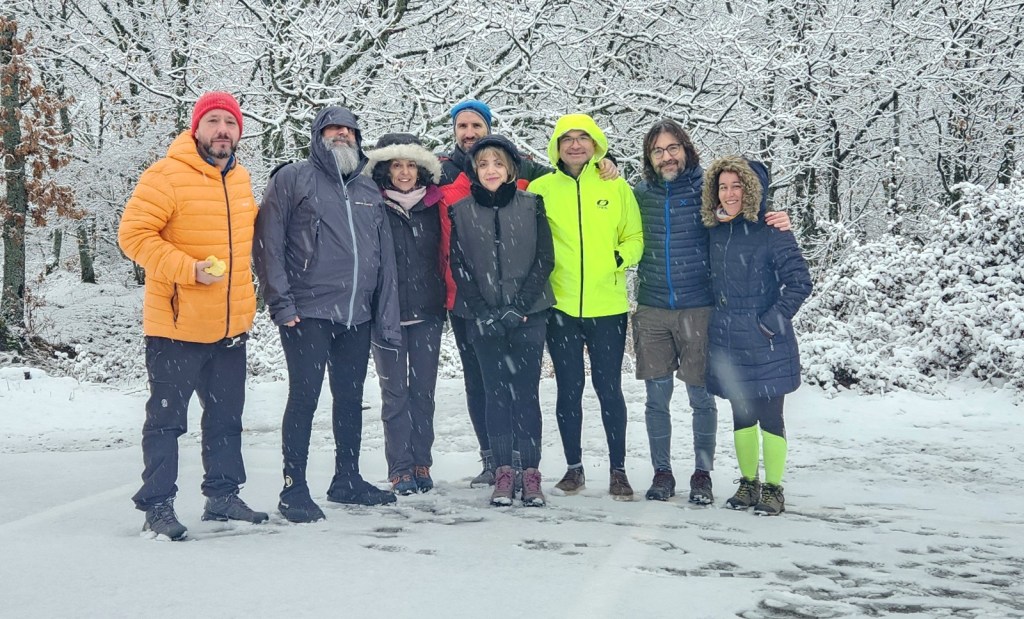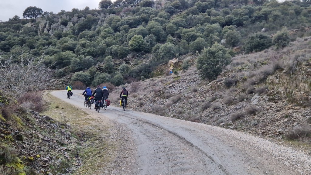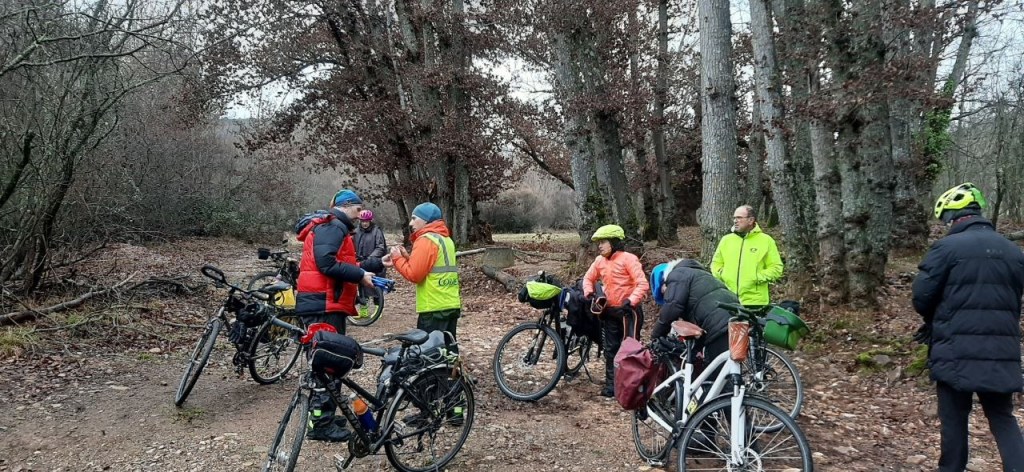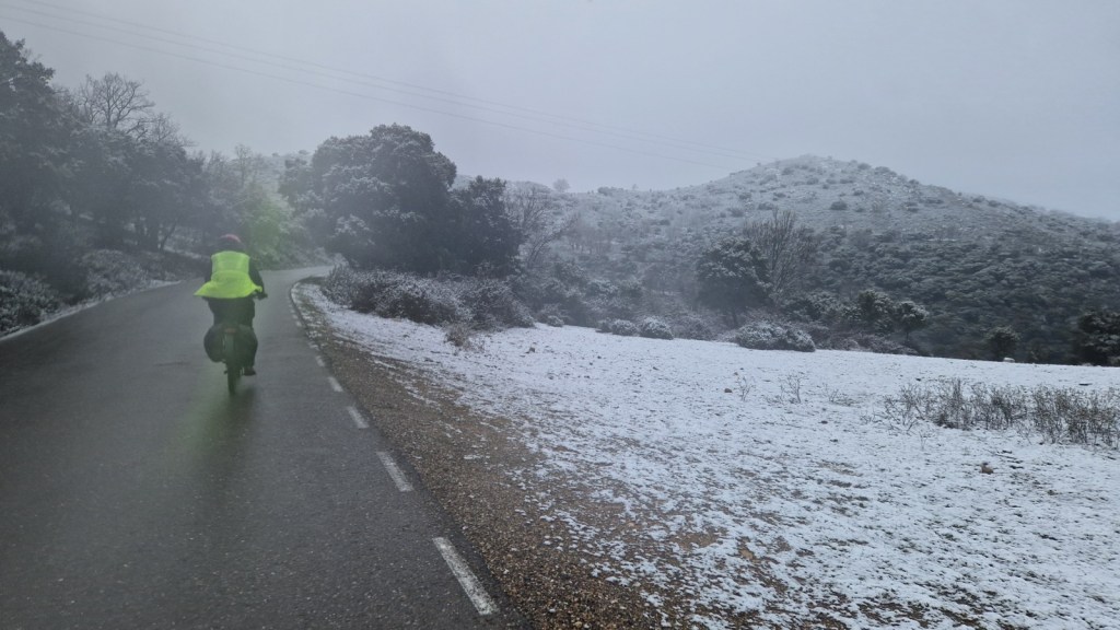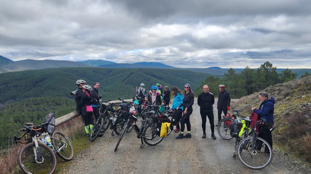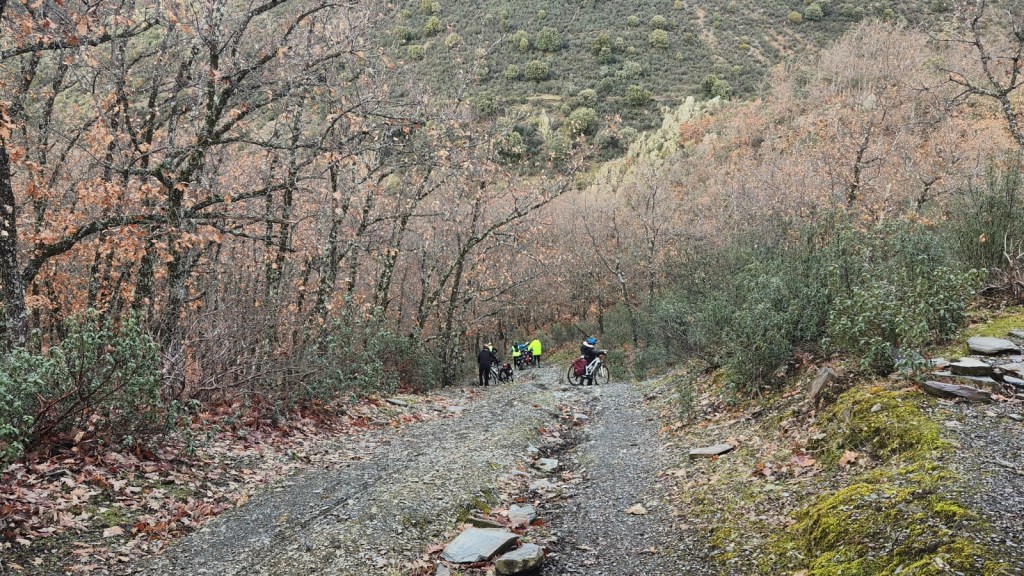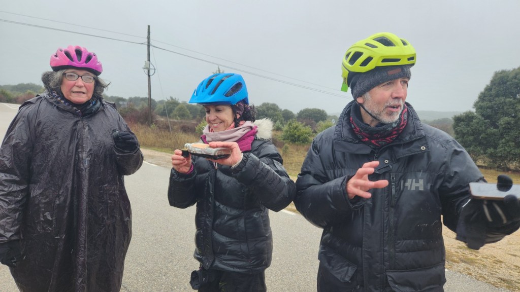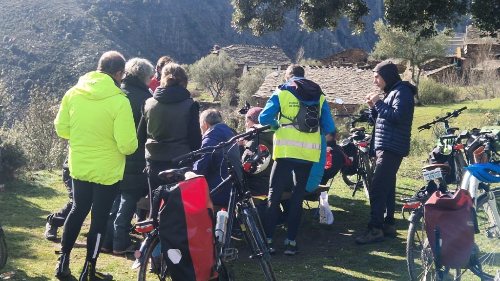 El protagonista inesperado fue el manto blanco: nos tocó ciclar sobre nieve cuajada por encima de los 1.200 metros, añadiendo un punto de épica a cada pedalada. Finalmente, todos los caminos condujeron al Monasterio de Bonaval (aprox. 850 m), donde el grupo se reunificó rodeado de historia cisterciense. Tras el esfuerzo, repusimos fuerzas comiendo a orillas del río Jarama, cerca de Retiendas (890 m), antes de dirigirnos a Tamajón (1.030 m) para la pernocta y el merecido descanso.