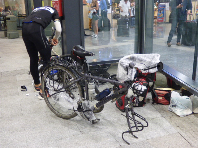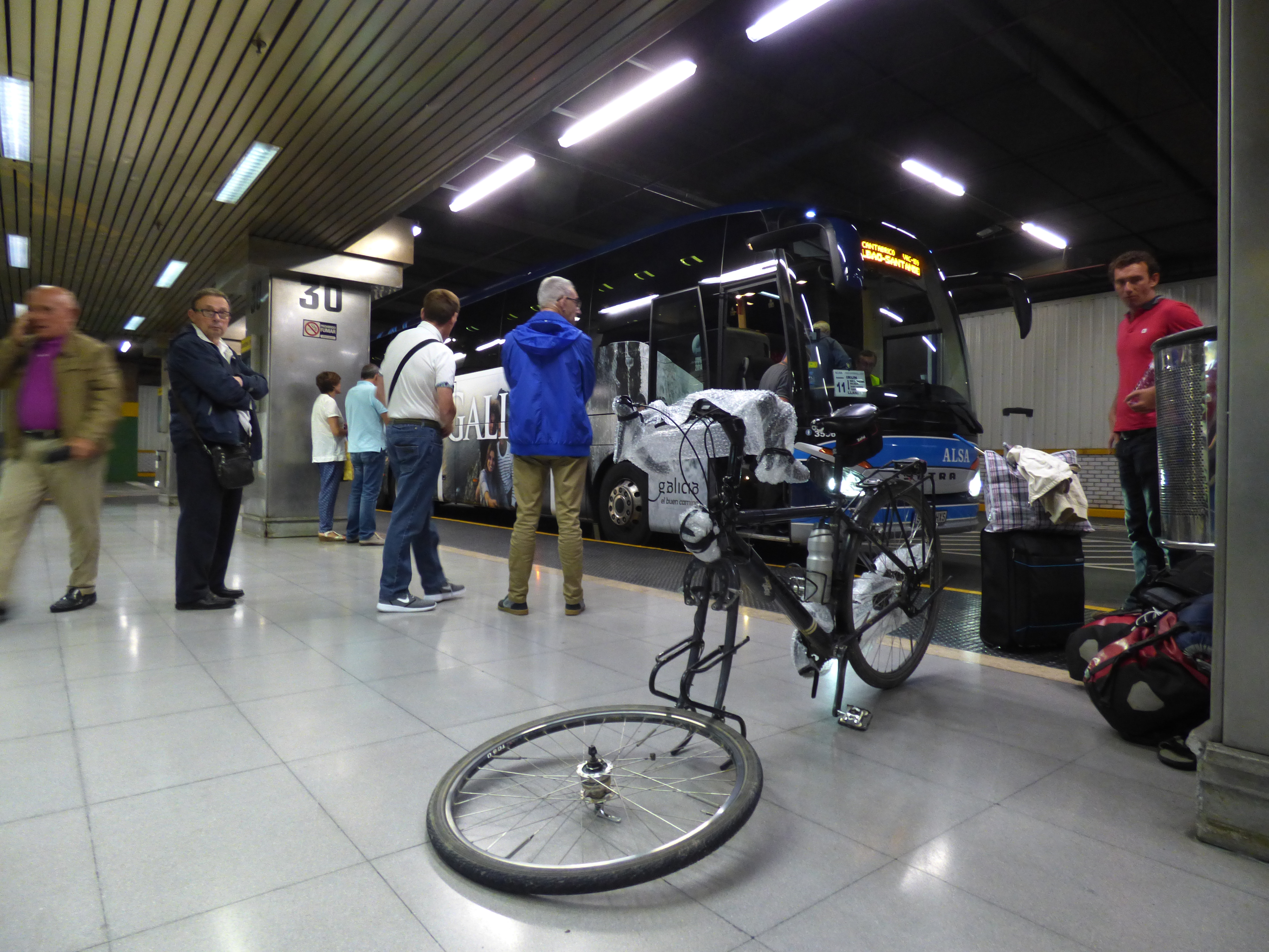 Tenemos en primer lugar el habitual, cuando quieres desplazarte del punto A al punto B y has de informarte de las condiciones que se te exigen por parte de la compañía de autocares. Por lo general, una vez has indicado que viajas con bicicleta —y pagado el billete de la misma—, has de quitarle la rueda delantera, los pedales (no siempre, depende de la compañía) y, seguro seguro, cubrir todo el sistema de transmisión con algún plástico/cartón/etc., que evite manchar el equipaje del resto de viajeros.