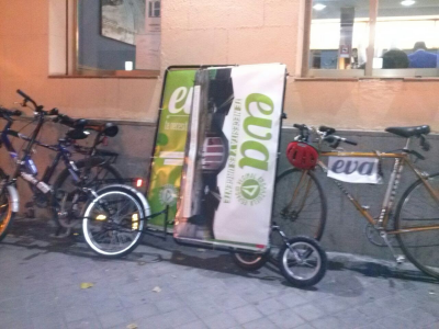Bicicarro de EVA Bicicarro con un cartel vertical de EVA apoyado en la pared junto con otras dos bicis.