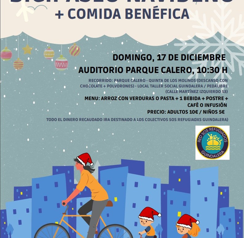 Un paseo en bici navideño en el que tomaremos polvorones y chocolate en la Quinta de los Molinos. Comeremos a beneficio de SOS Refugiados Guindalera y el proyecto Bicis Temporeras de Jerez de la Frontera. Continúa leyendo Bicipaseo navideño + Comida solidaria