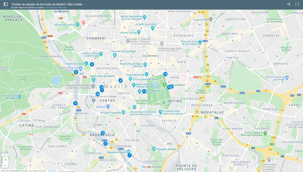 - Tiendas de alquiler de bicicletas: mapa basado en Google Maps con las tiendas del listado anterior